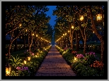 Rośliny: Noc, Ogród, Latarnie, Drzewa, Kwiaty, Ścieżka
