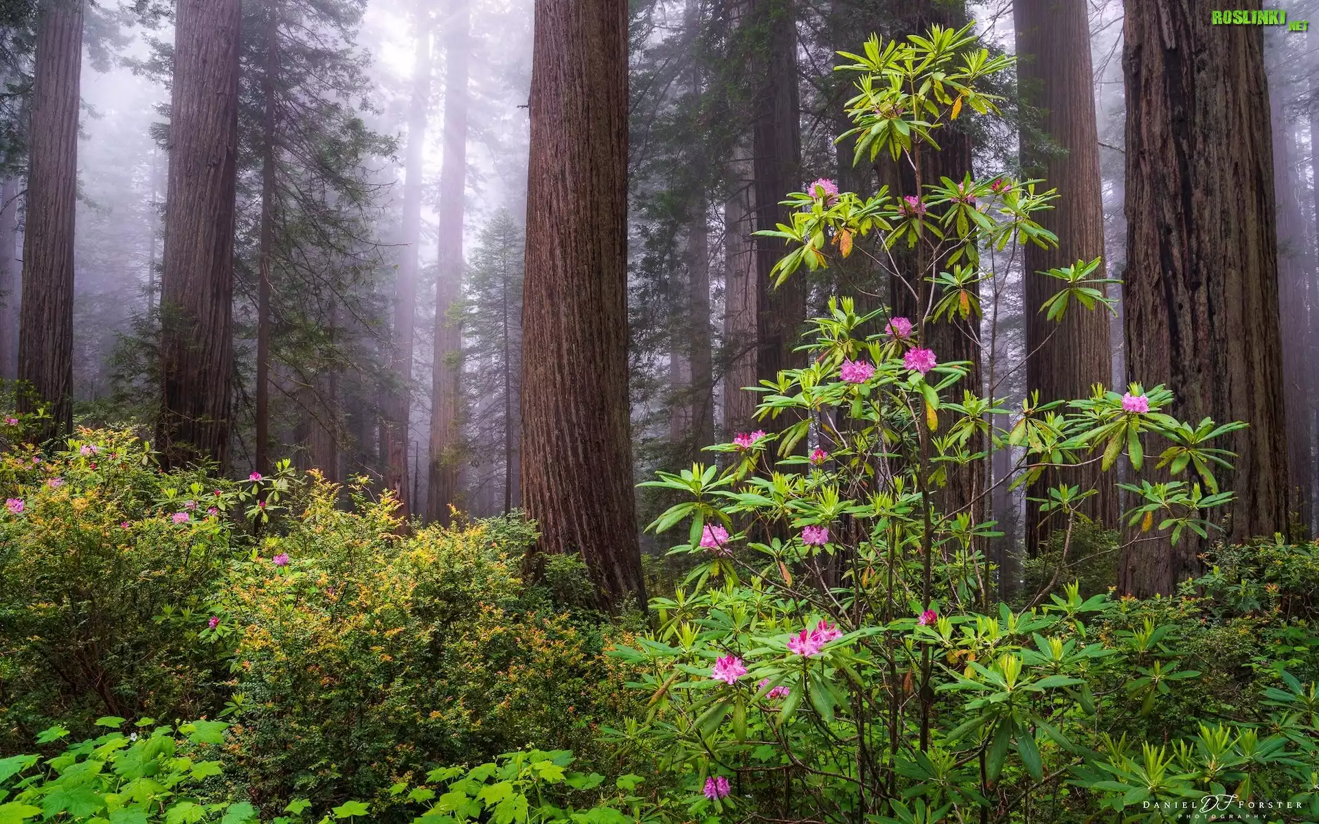 Rośliny: Stany Zjednoczone, Kalifornia, Park Narodowy Redwood, Drzewa, Sekwoje, Różanecznik, Krzewy, Mgła