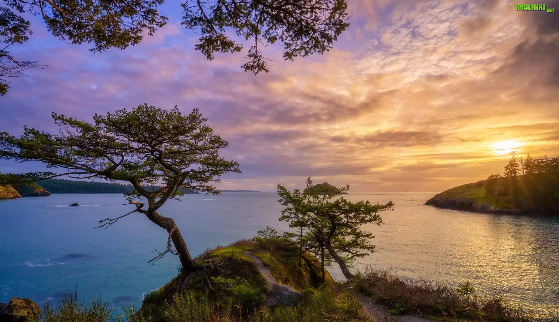 Rośliny: Drzewa, Zachód słońca, Chmury, Skała, Morze