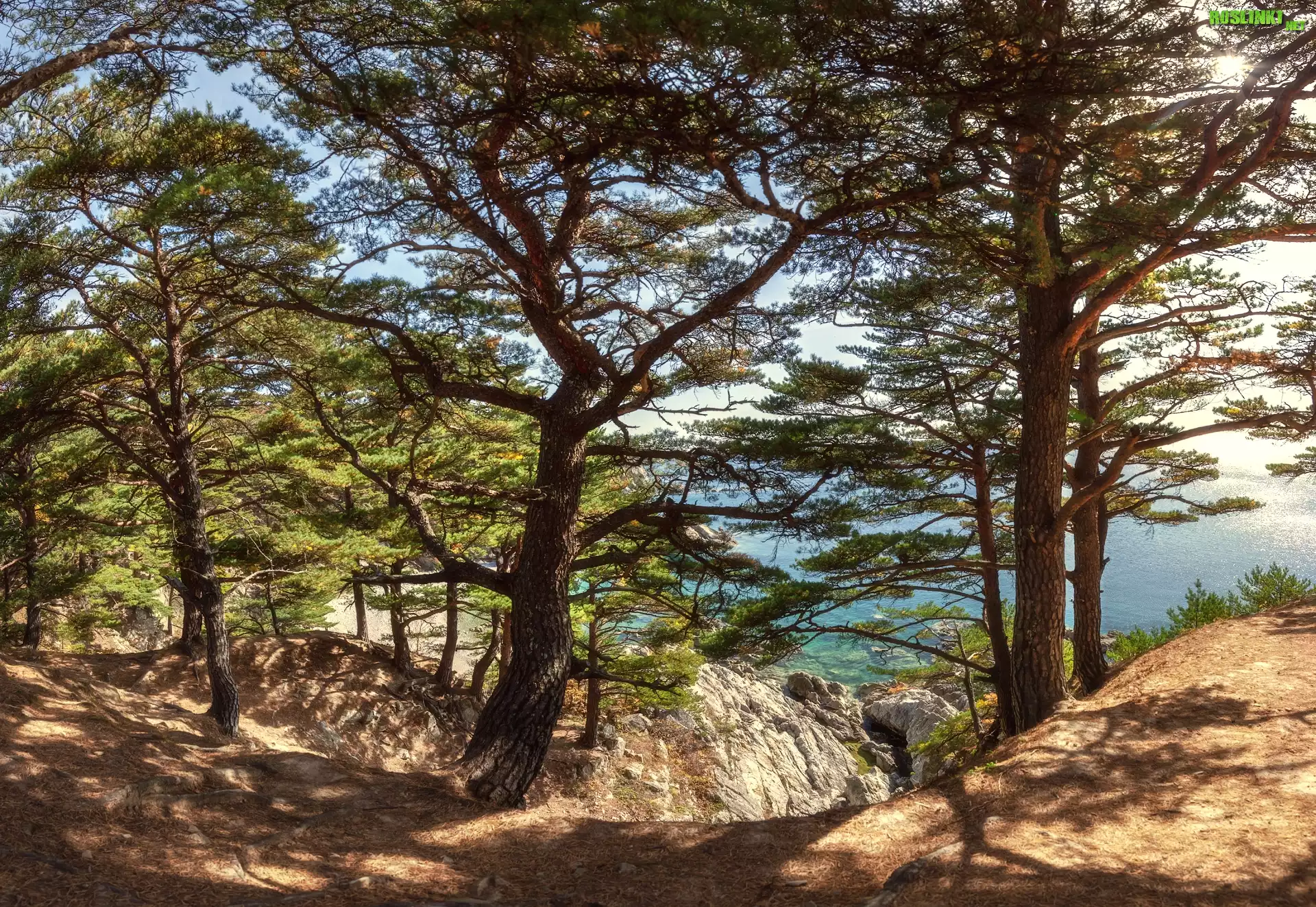 Rośliny: Drzewa, Morze, Skały, Piasek