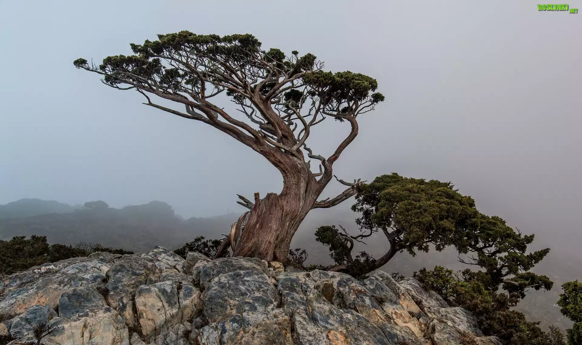 Rośliny: Drzewa, Sosny, Skały, Mgła