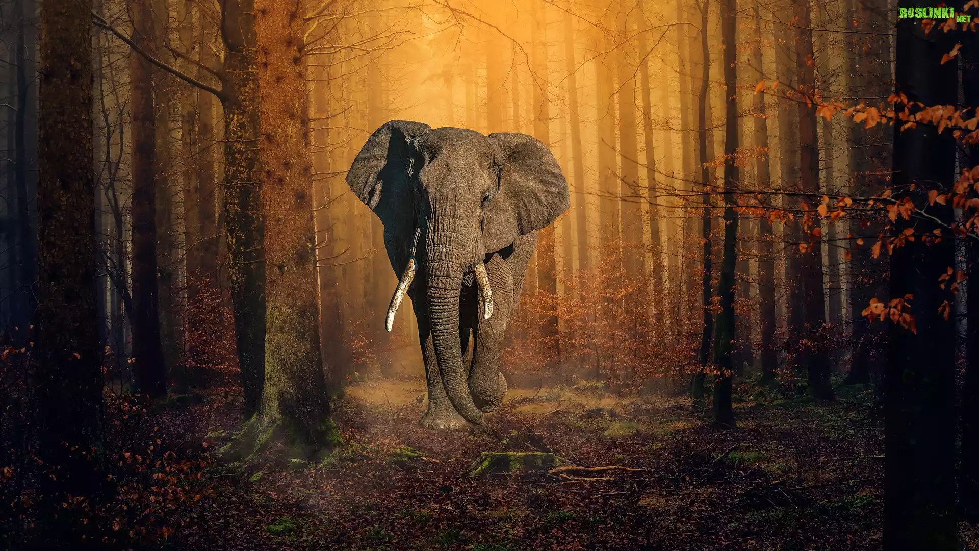 Rośliny: Las, Drzewa, Słoń, Zachód słońca