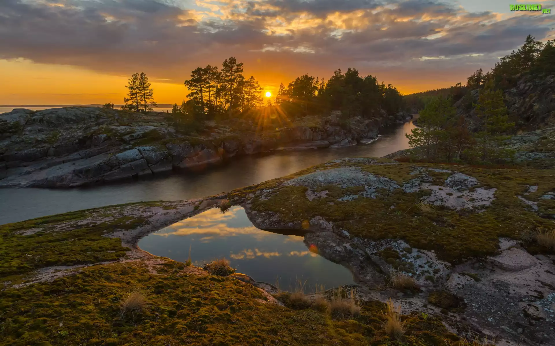 Rośliny: Jezioro, Skały, Chmury, Drzewa, Promienie słońca