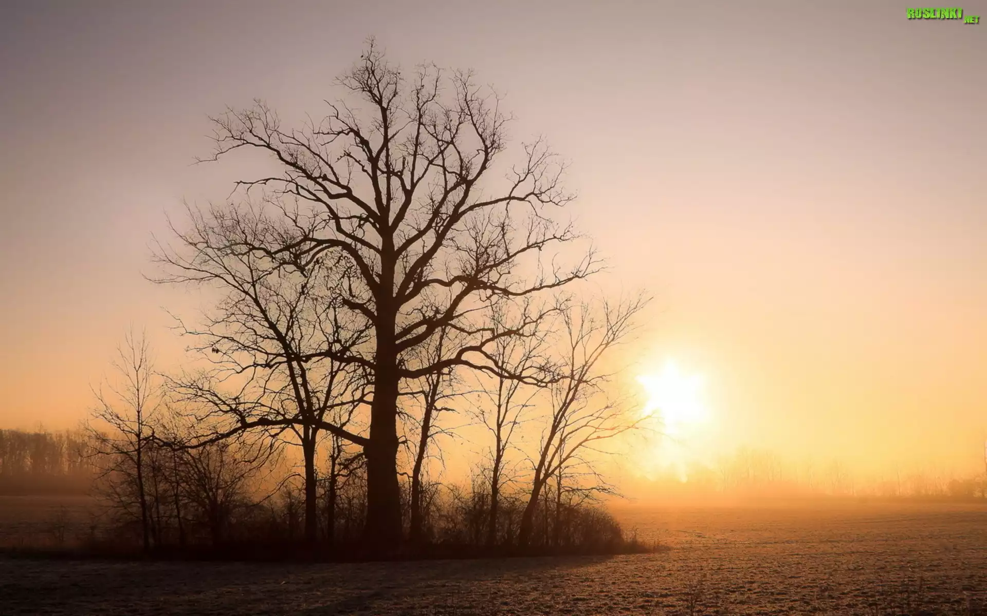 Rośliny: Drzewa, Pola, Mgła, Wschód, Słońca, Jesień