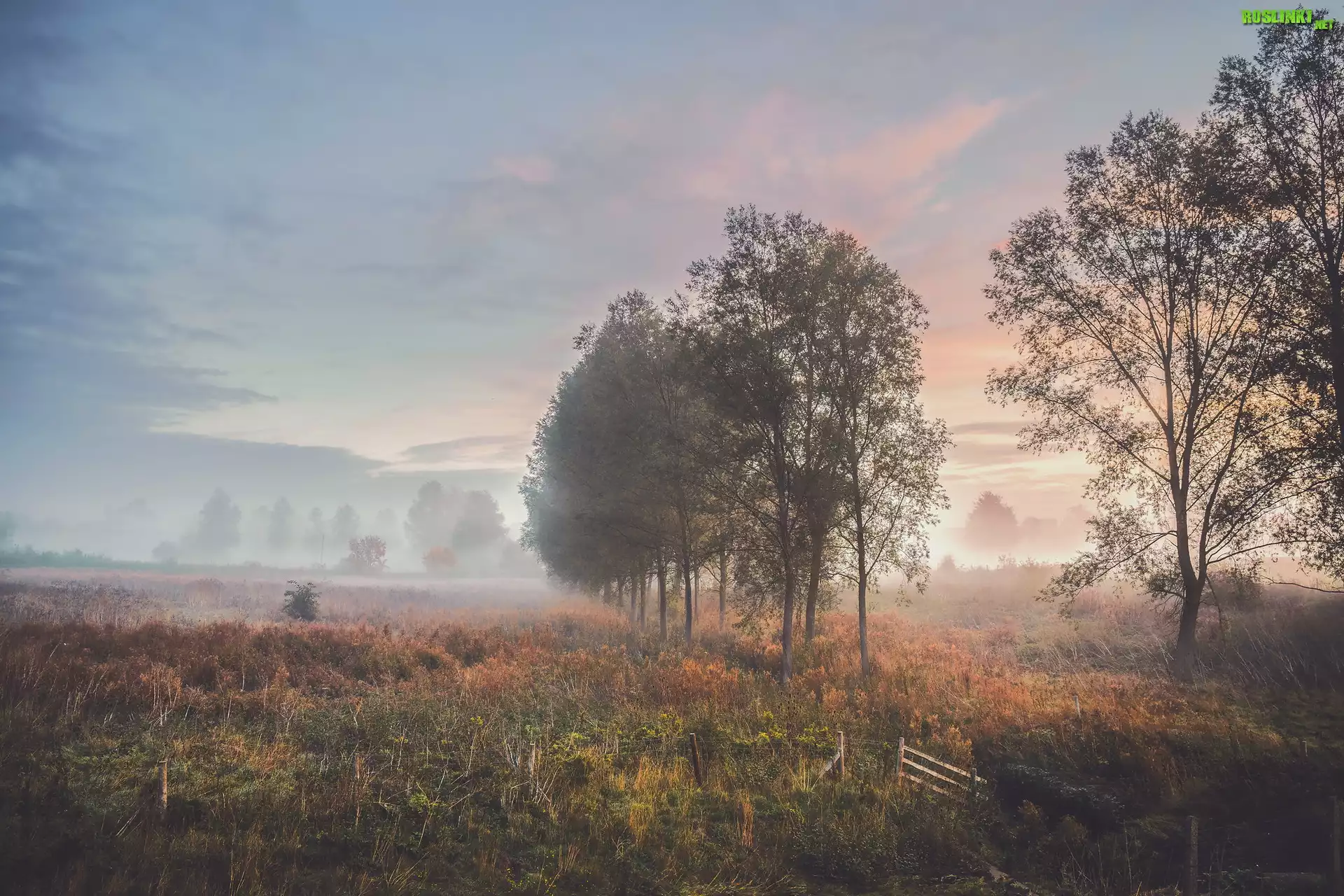 Drzewa, Mgła, Poranek, Wschód słońca, Łąki