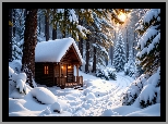 Rośliny: Drewniany, Dom, Las, Drzewa, Zima, Śnieg