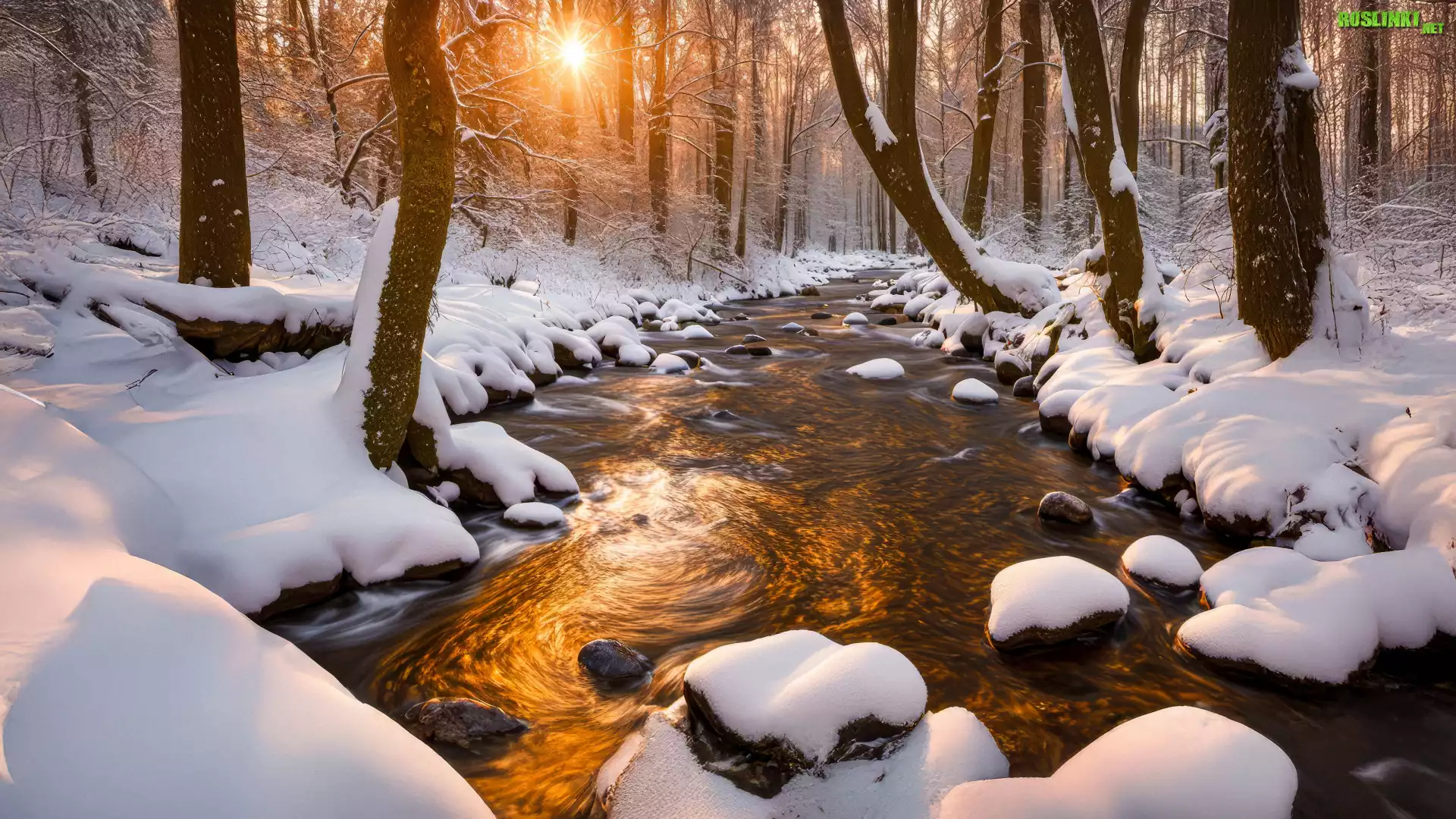 Rośliny: Zima, Las, Śnieg, Drzewa, Rzeka, Kamienie, Słońce