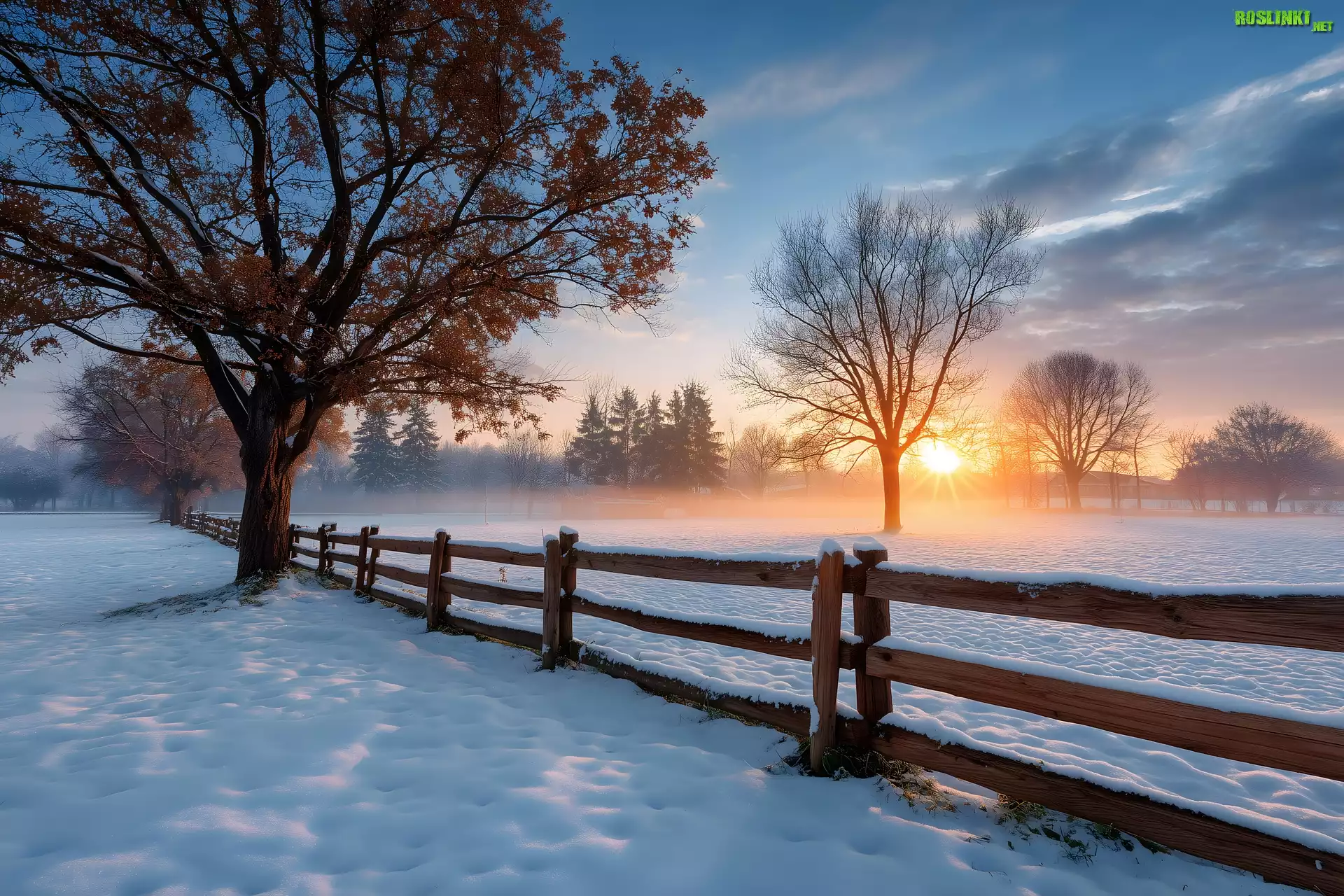 Rośliny: Zima, Ogrodzenie, Śnieg, Drzewa, Chmury, Zachód słońca