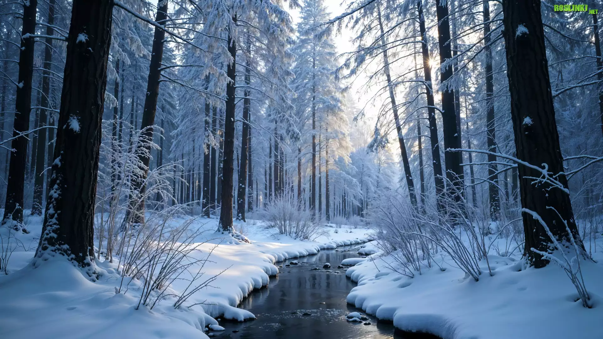 Rośliny: Zima, Las, Ośnieżone, Drzewa, Rzeka, Śnieg