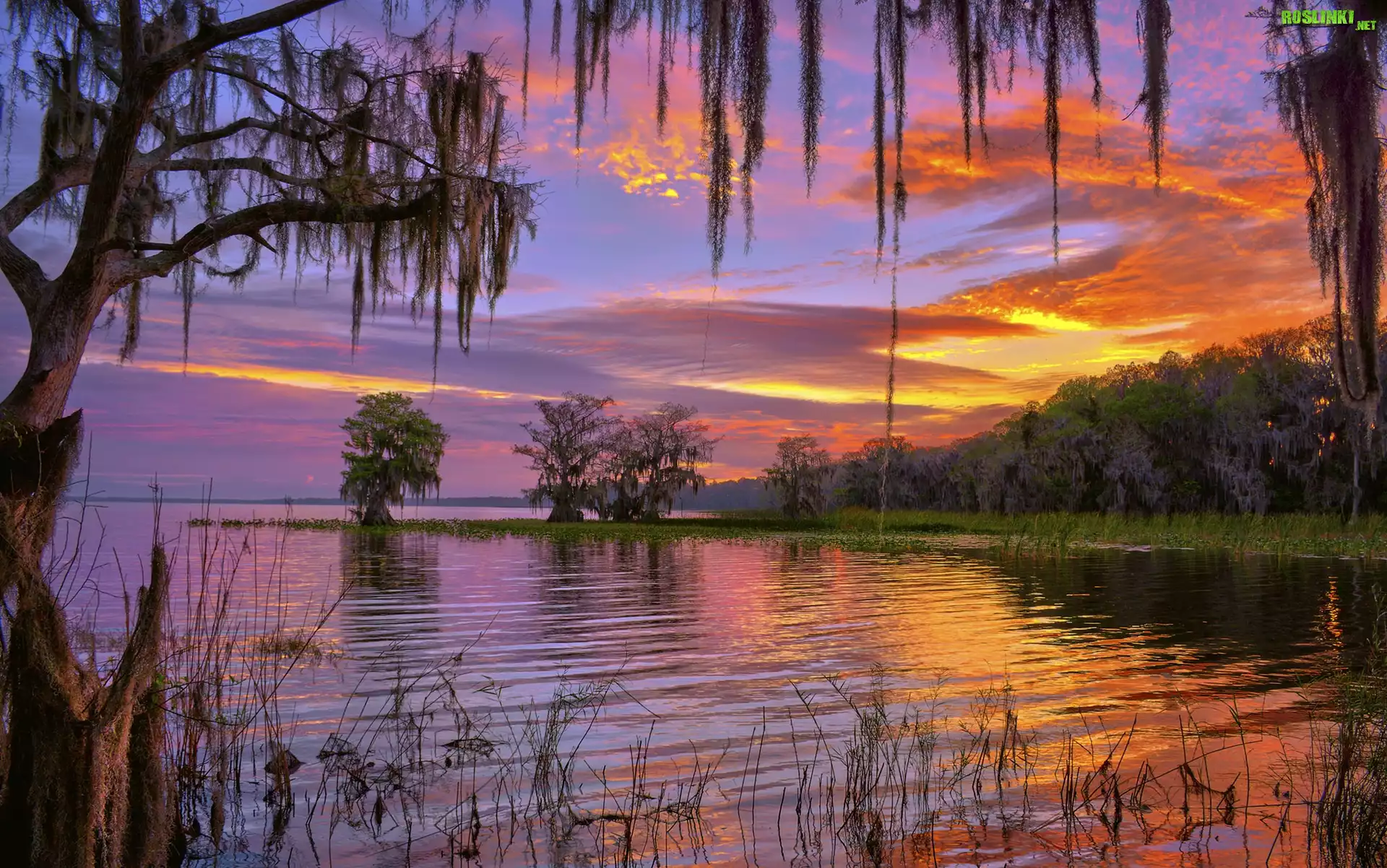 Stany Zjednoczone, Stan Floryda, Zachód słońca, Jezioro Istokpoga, Drzewa