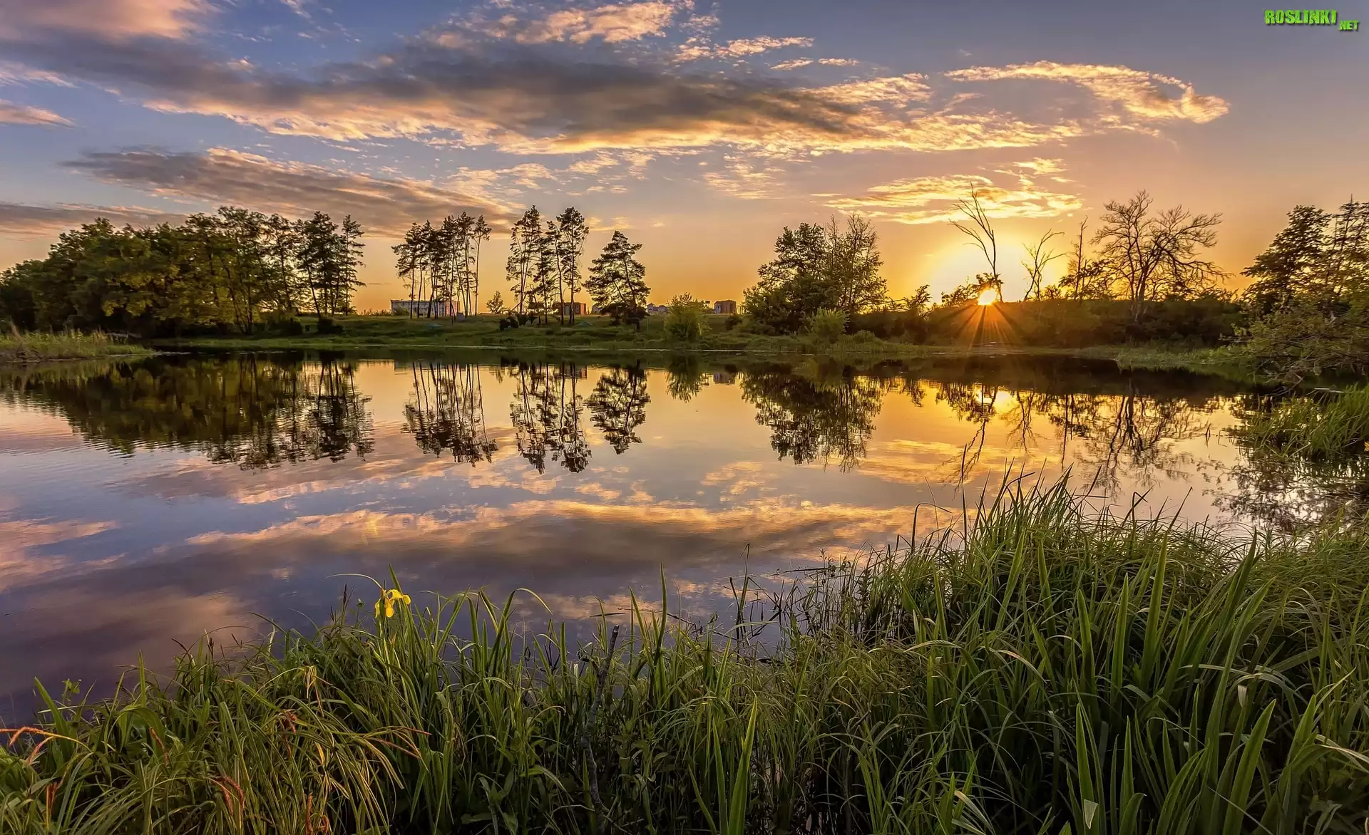 Rośliny: Staw, Drzewa, Trawy, Wschód słońca, Chmury, Odbicie