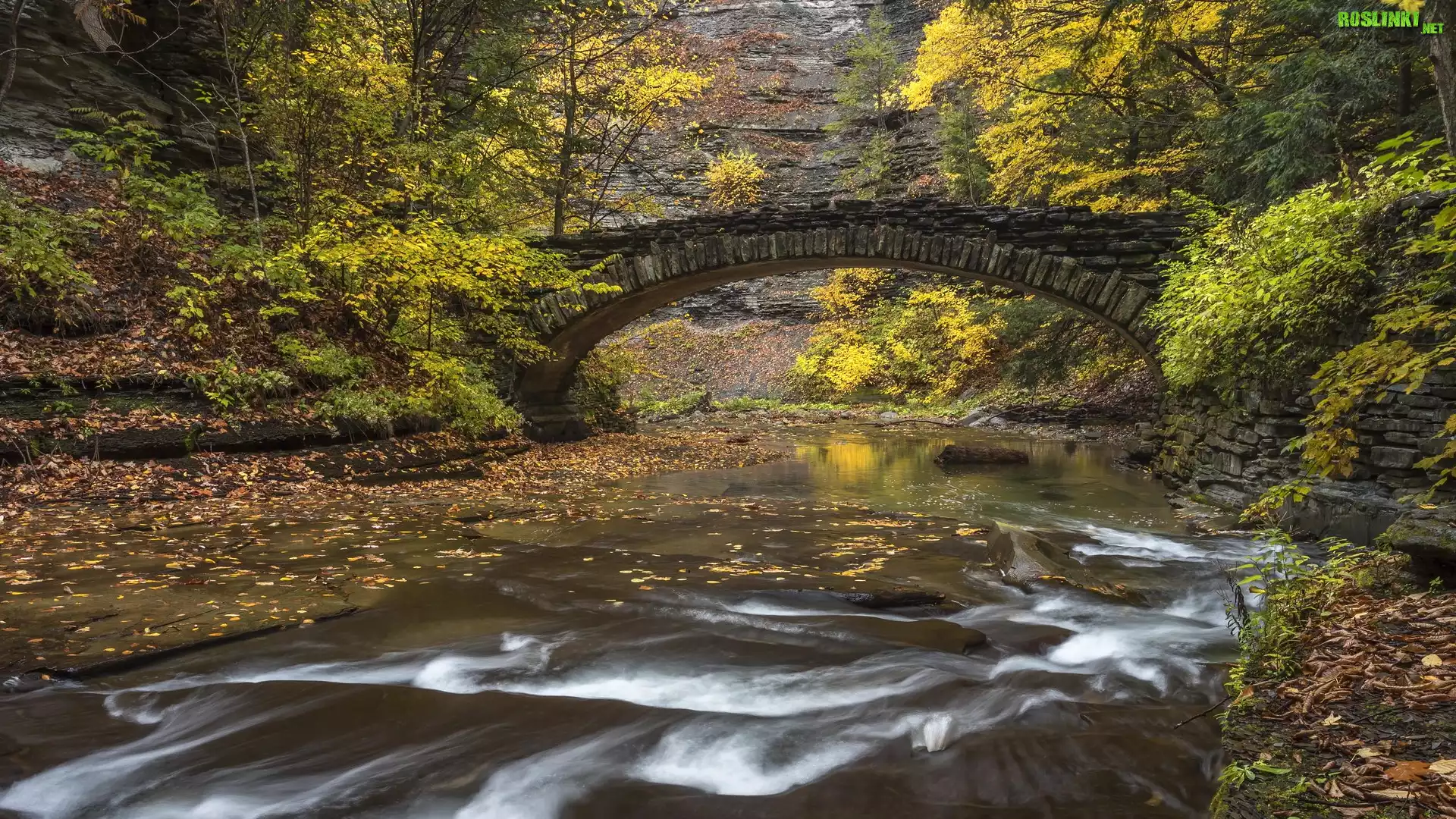 Rośliny: Drzewa, Skały, Rzeka, Stony Brook River, Kamienny, Most, Stan Nowy Jork, Stany Zjednoczone