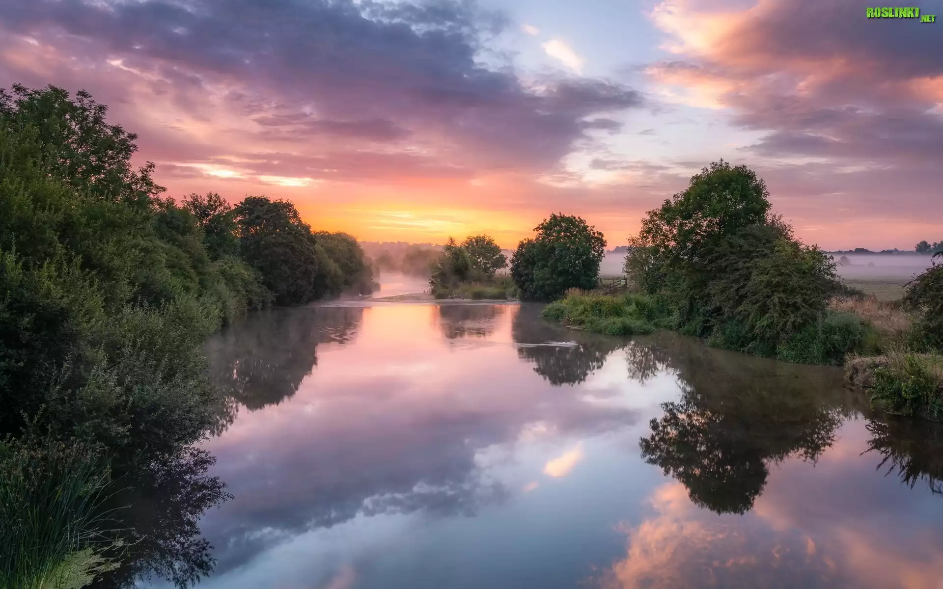 Rośliny: Rzeka, River Stour, Drzewa, Mgła, Chmury, Anglia