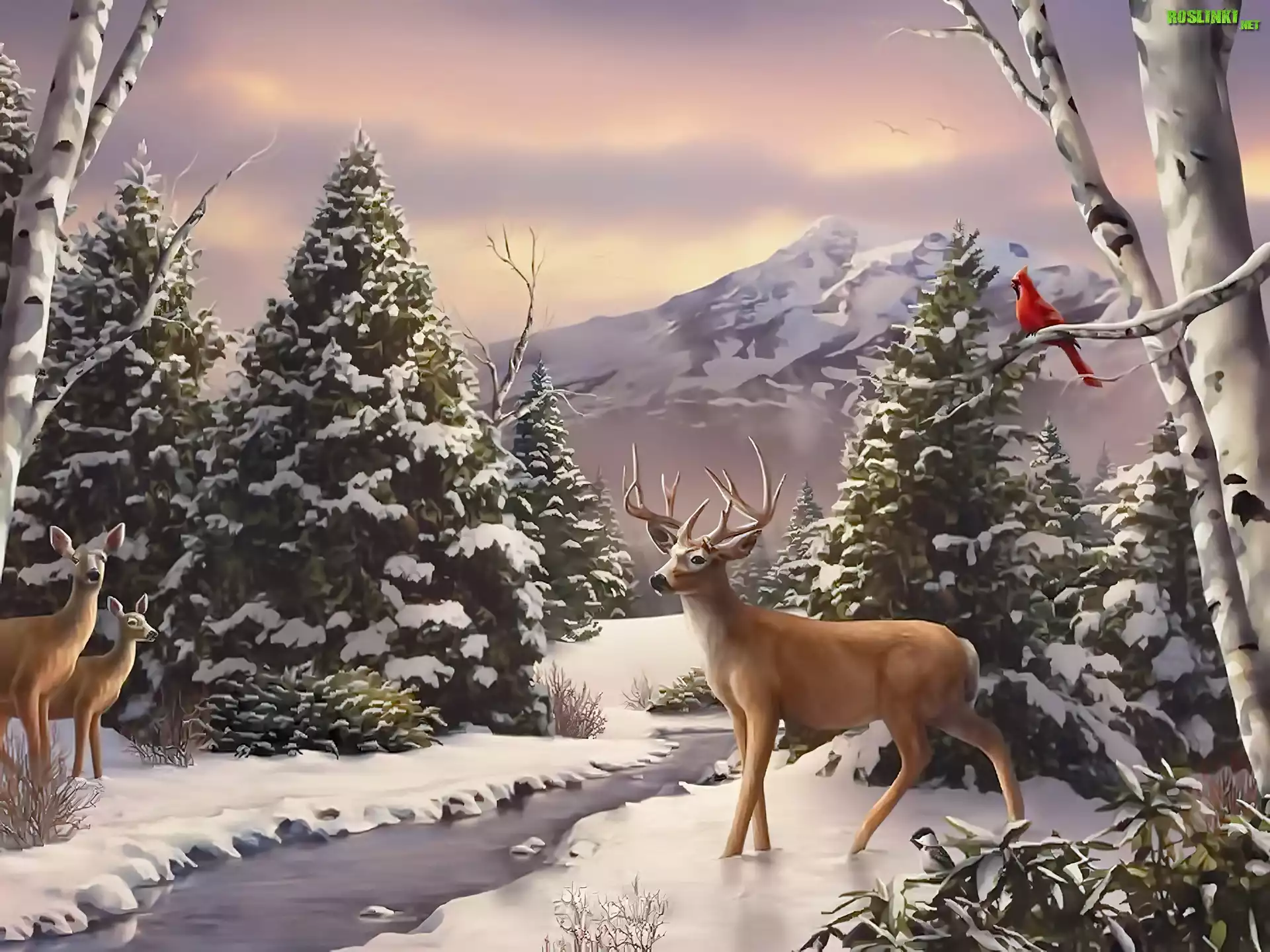 Rośliny: Drzewa, Jeleń, Strumyk, Malarstwo