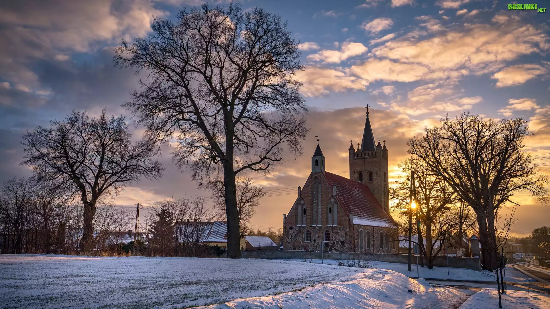 Rośliny: Zima, Domy, Drzewa, Kościół św Marka Ewangelisty, Chojna, Powiat gryfiński, Polska