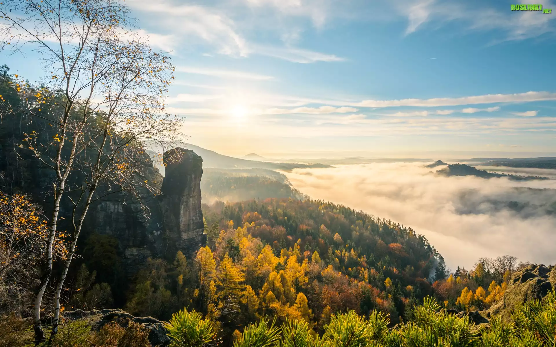 Niemcy, Park Narodowy Saskiej Szwajcarii, Góry Połabskie, Skały, Drzewa, Jesień, Mgła, Chmury, Wschód słońca |