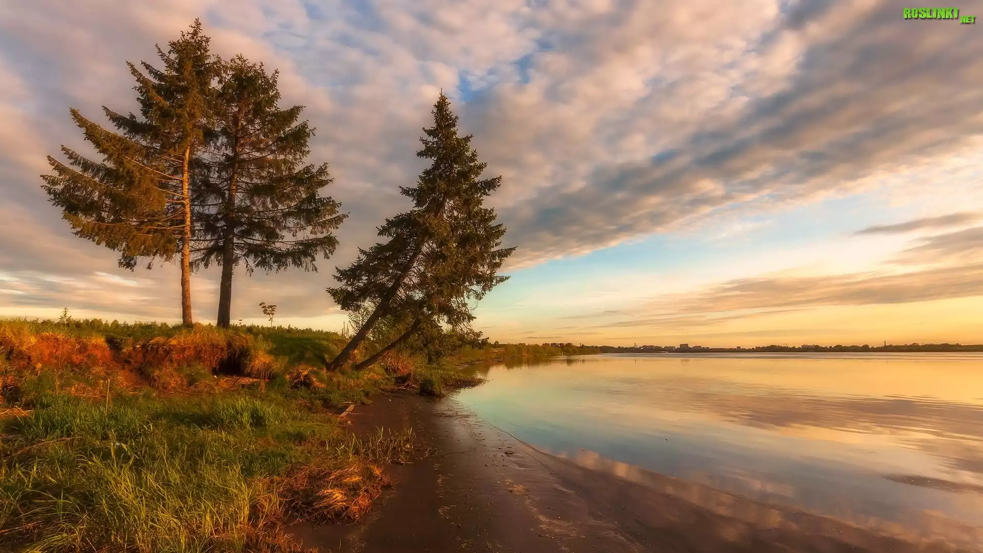 Rośliny: Jezioro, Blask, Słońca, Drzewa, Sosny, Trawa