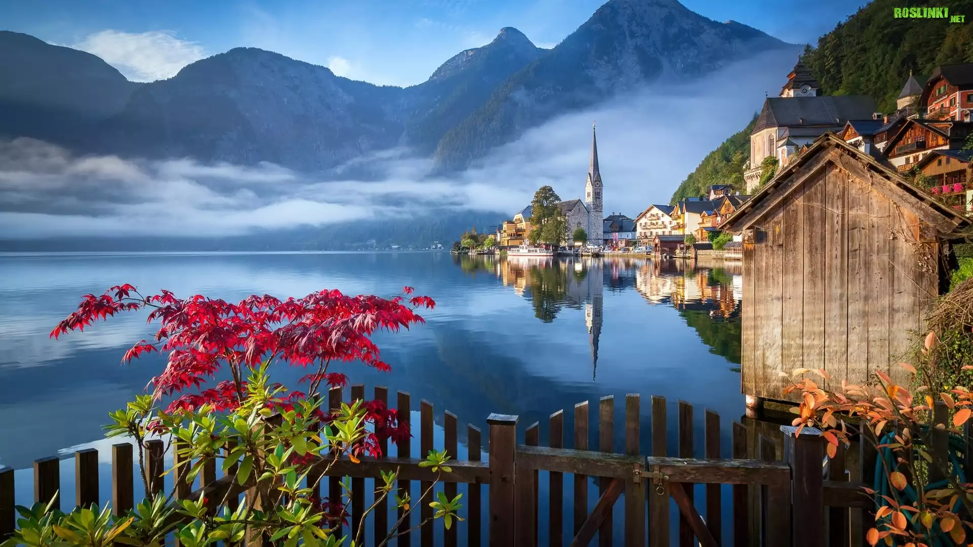 Rośliny: Austria, Hallstatt, Jezioro Hallstättersee, Domy, Góry, Kościół, Mgła, Drzewa