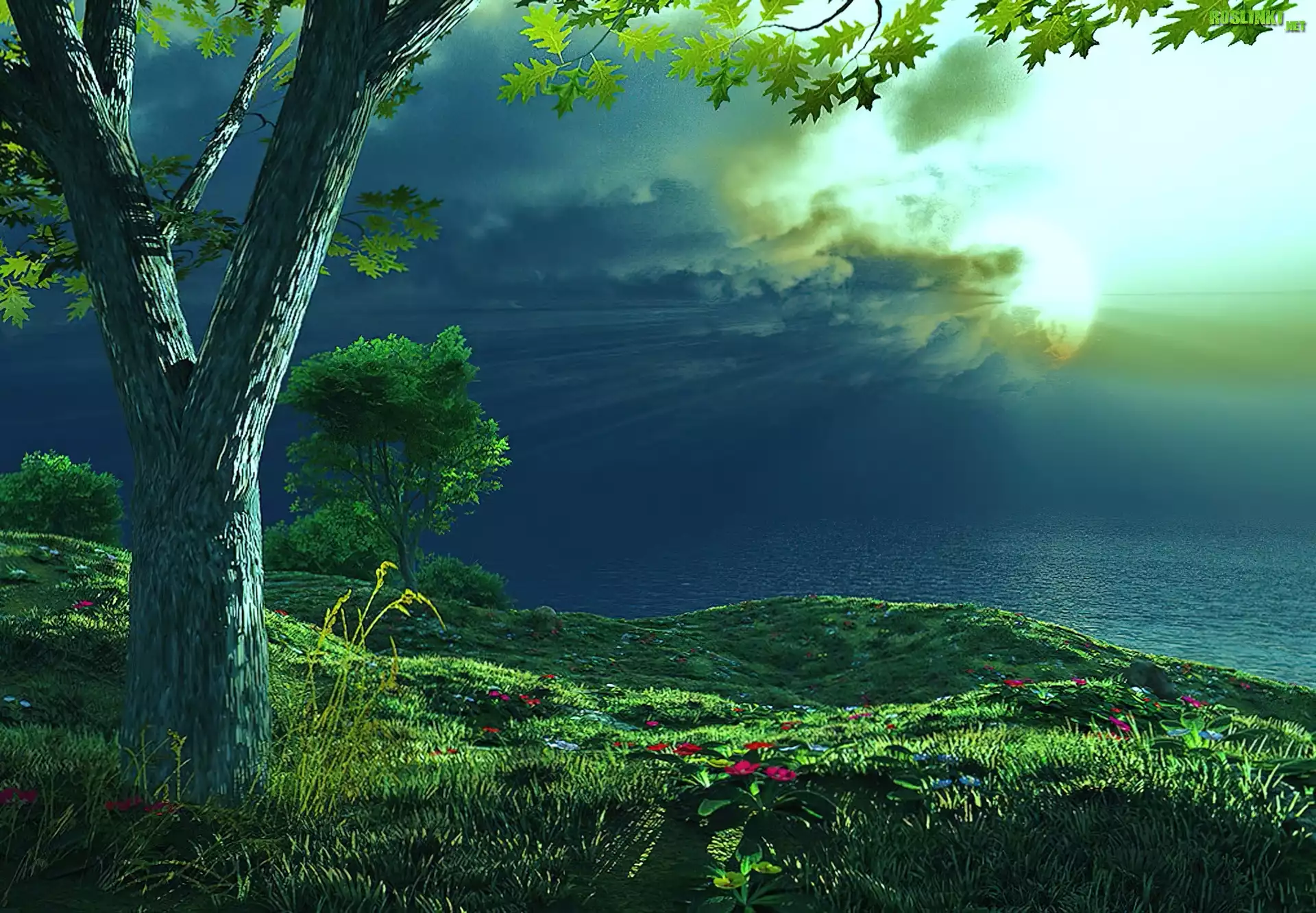 Rośliny: Drzewa, Morze, Słońce, W, Chmurach