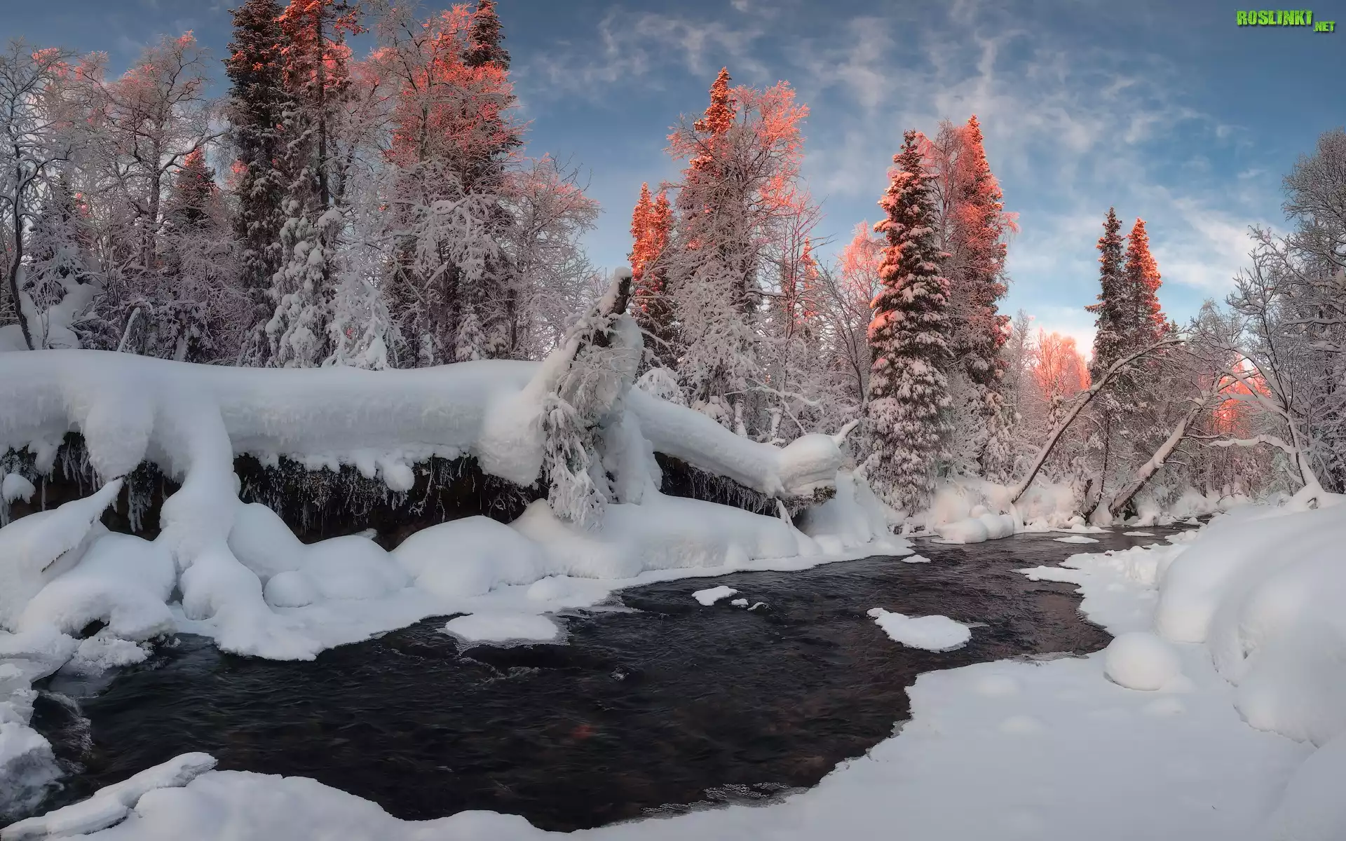 Rośliny: Zima, Rzeka, Ośnieżone, Drzewa, Rozświetlone, Wierzchołki