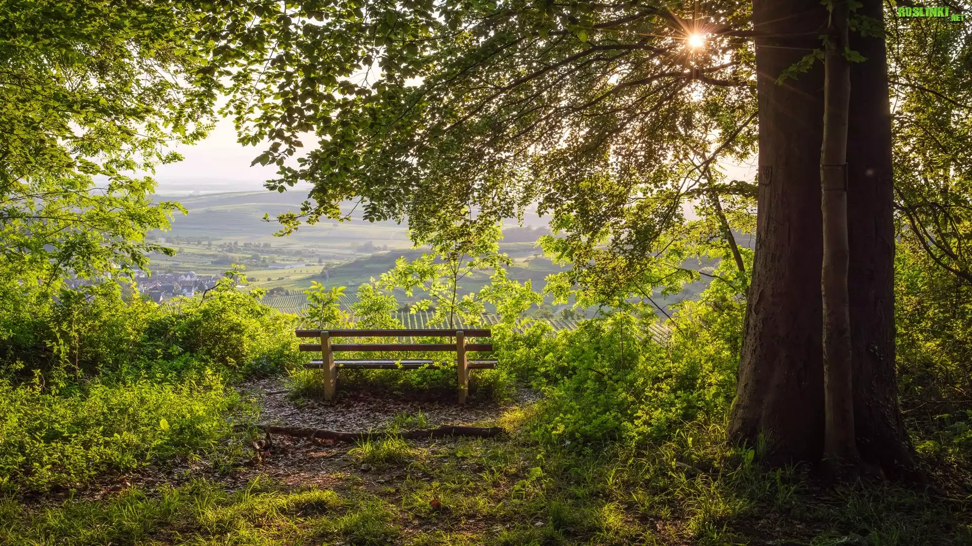 Rośliny: Niemcy, Kaiserstuhl, Winnice, Drzewa, Promienie słońca, Ławka