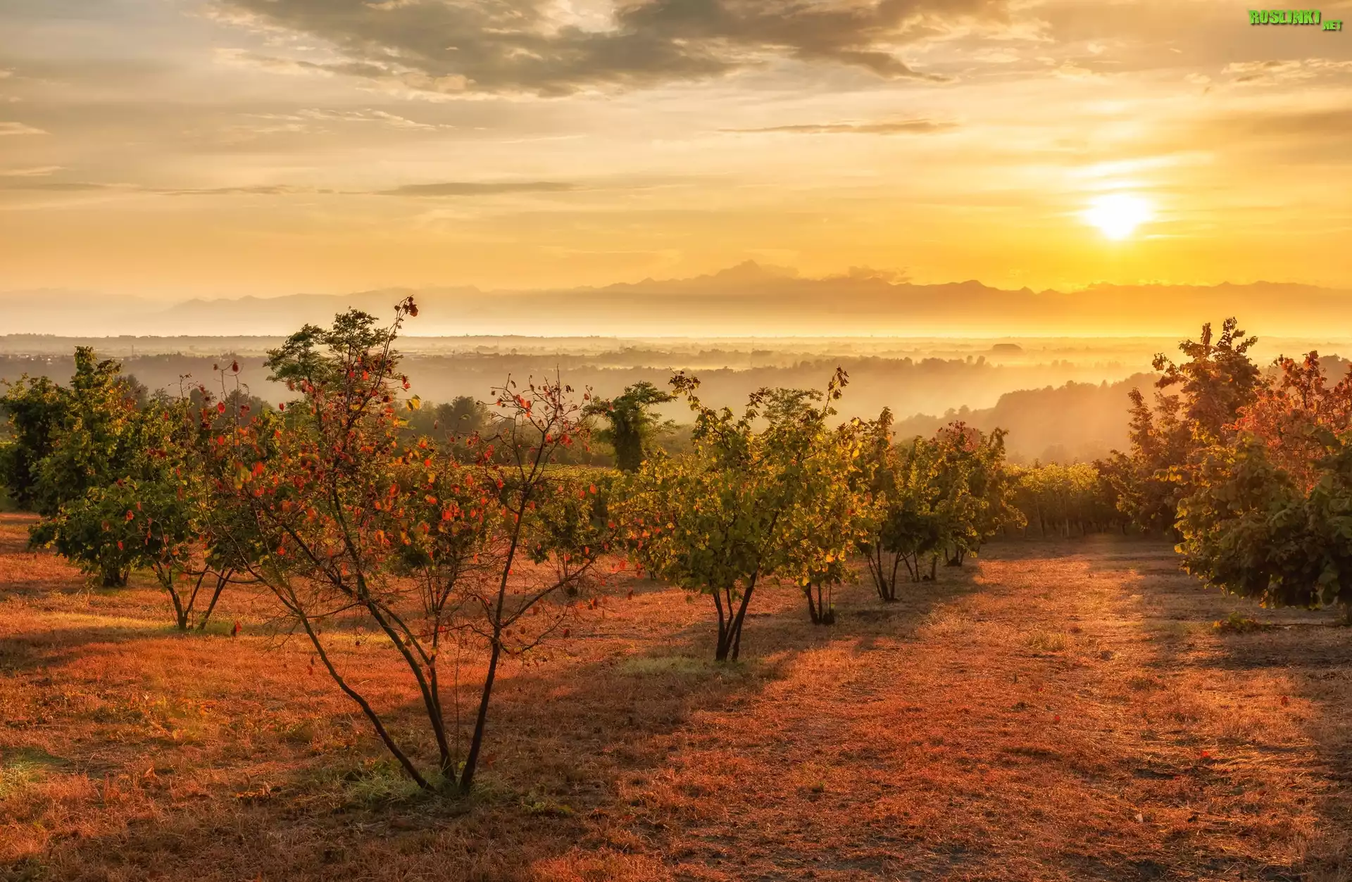 Pole, Drzewa, Krzewy, Mgła, Zachód słońca, Toskania, Włochy