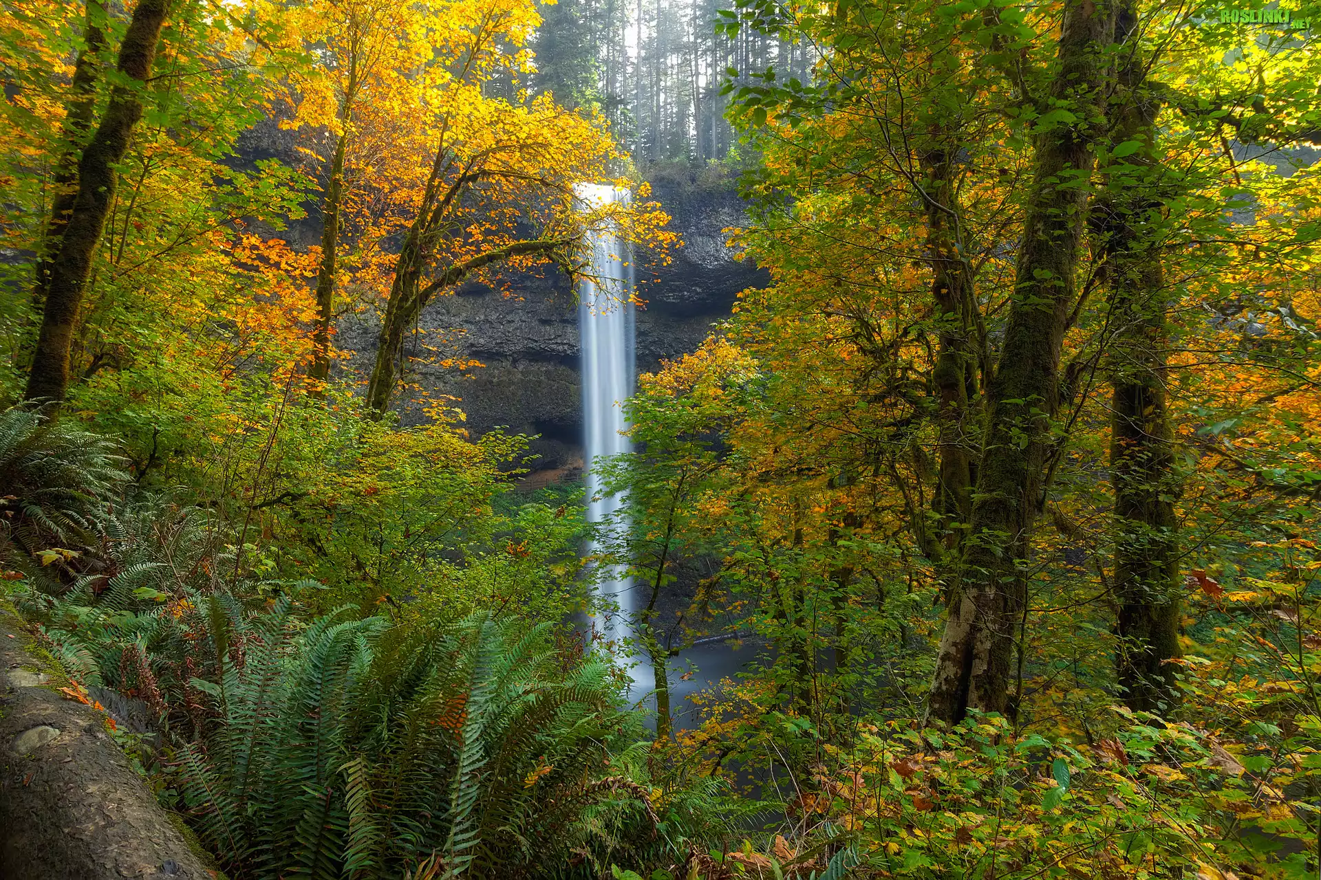 Wodospad South Falls, Las, Drzewa, Paprocie, Jesień, Park miejski Silver Falls, Oregon, Stany Zjednoczone |