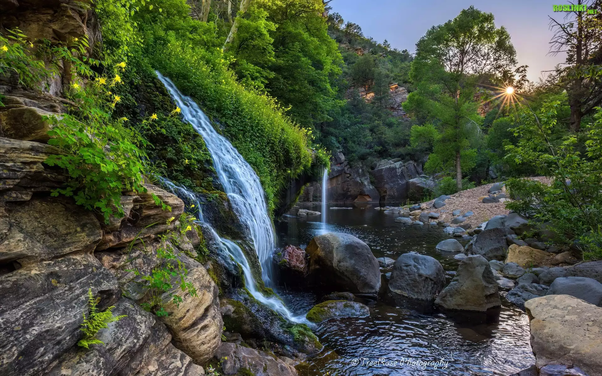 Rośliny: Wąwóz, Rzeka, Wodospad, Drzewa, Promienie słońca, Skała