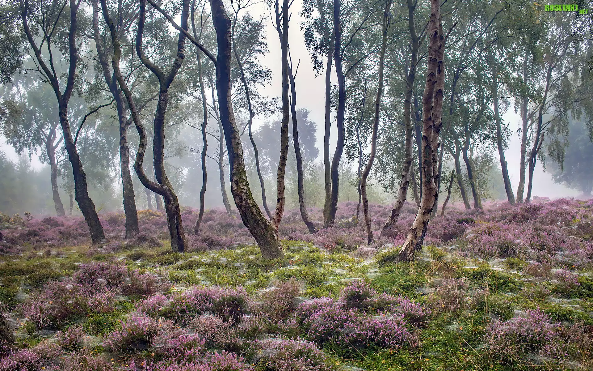 Rośliny: Anglia, Park Narodowy Peak District, Stanton Moor, Drzewa, Brzozy, Wrzosowisko, Mgła