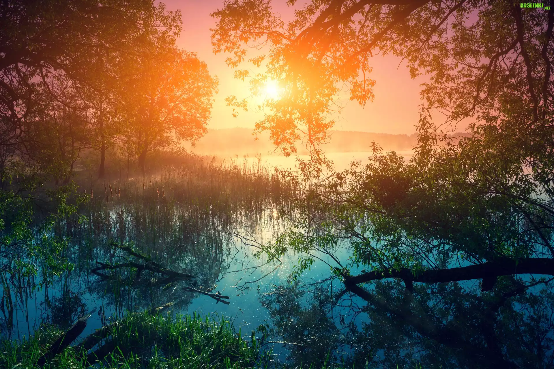 Rośliny: Drzewa, Jezioro, Wschód słońca