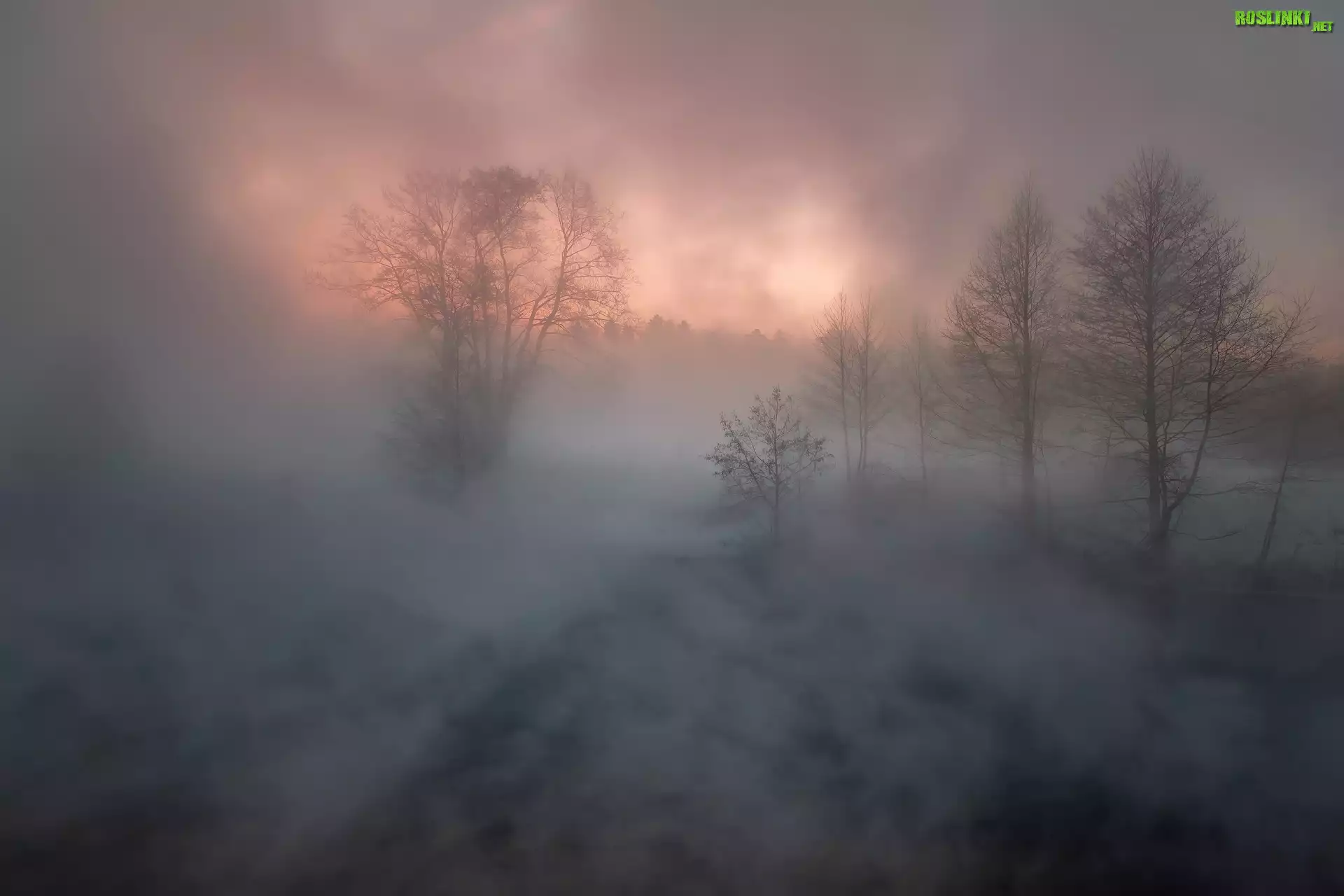 Drzewa, Gęsta, Mgła, Wschód słońca