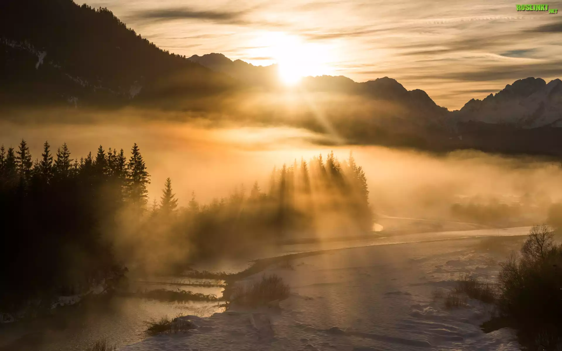 Rośliny: Drzewa, Śnieg, Góry, Mgła, Rzeka, Poranek, Wschód słońca, Zima