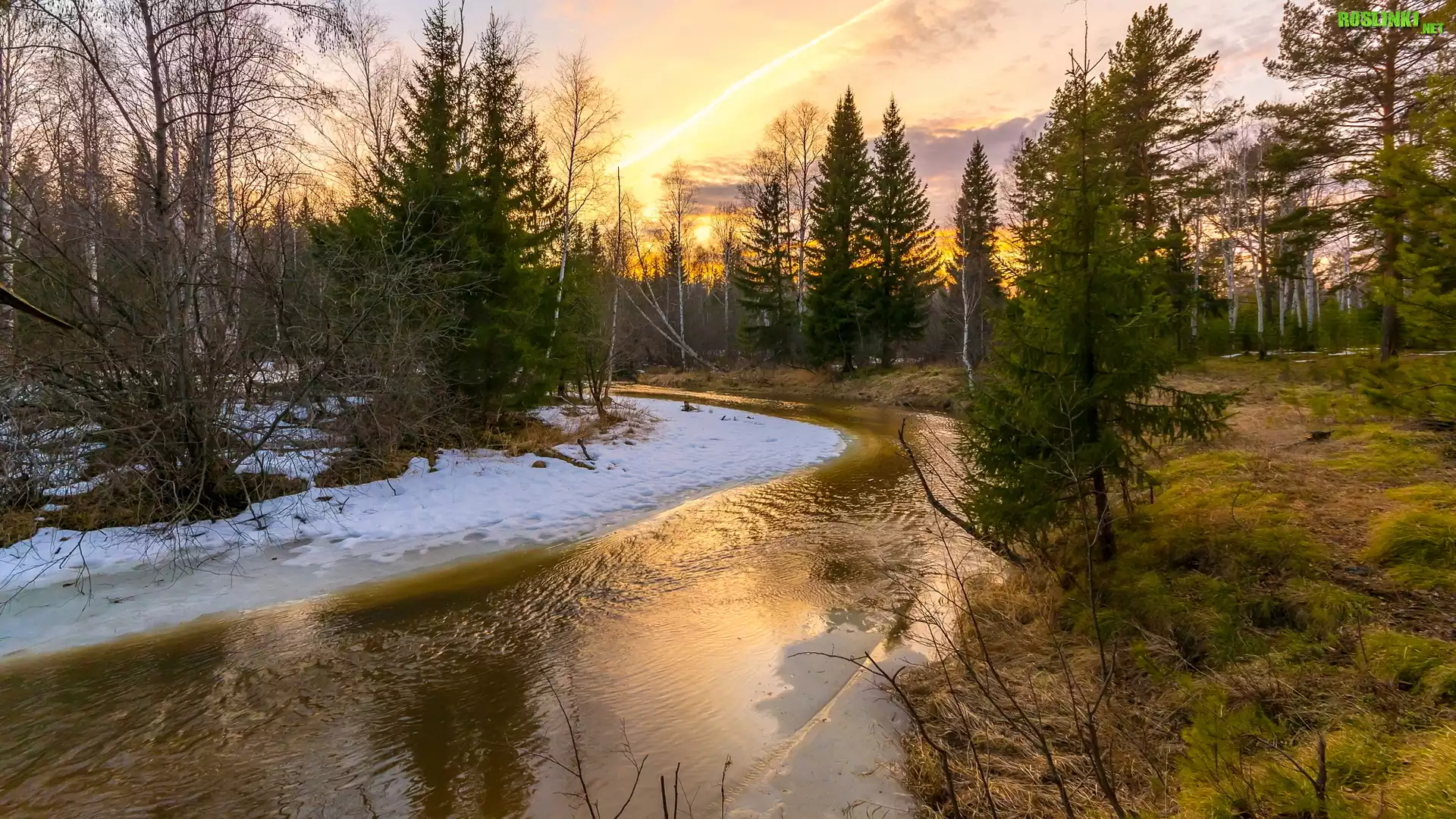 Rośliny: Drzewa, Las, Rzeka, Wschód słońca