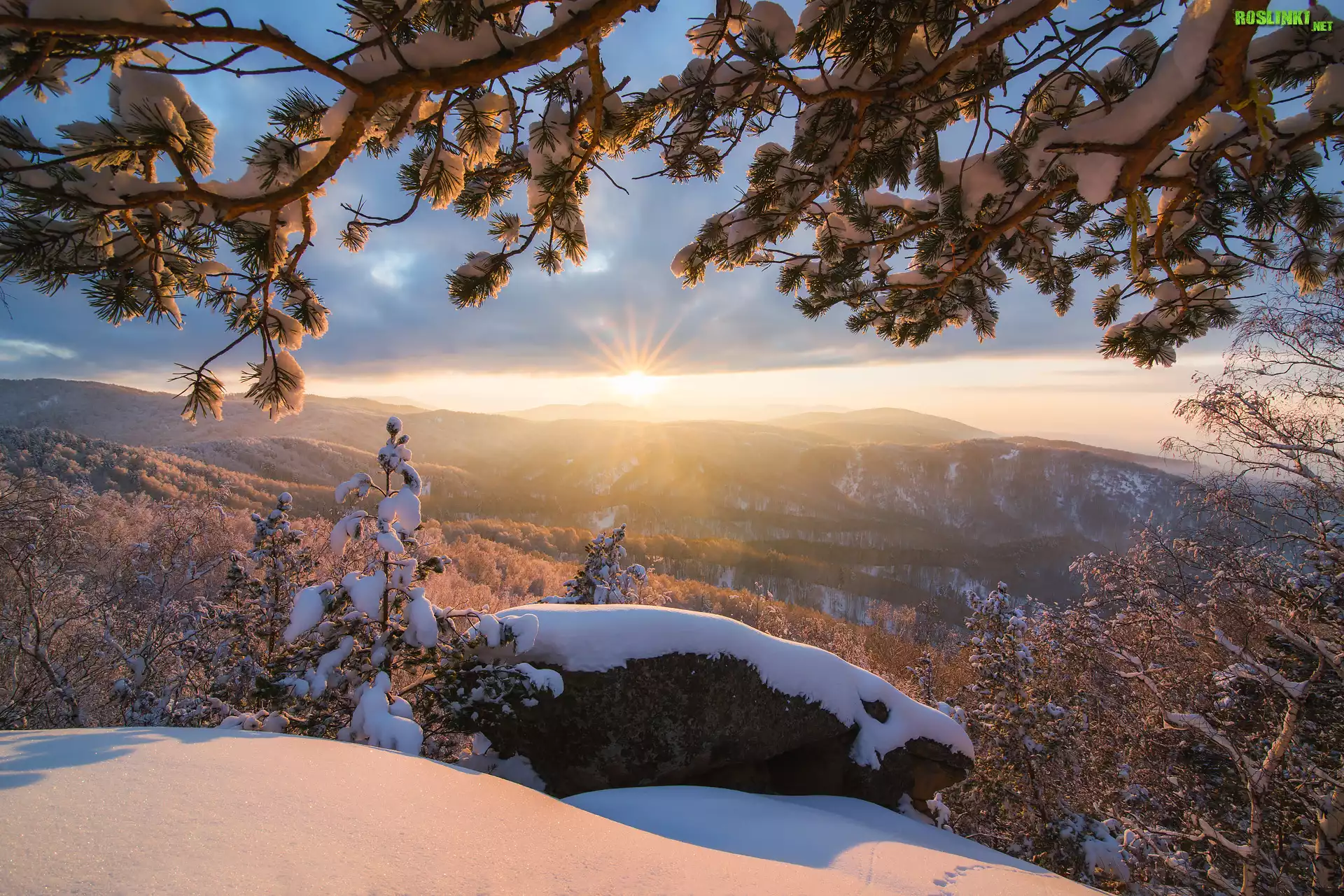 Rośliny:  Zima, Drzewa, Góry, Wzgórza, Promienie słońca, Biełokuricha, Kraj Ałtajski, Rosja
