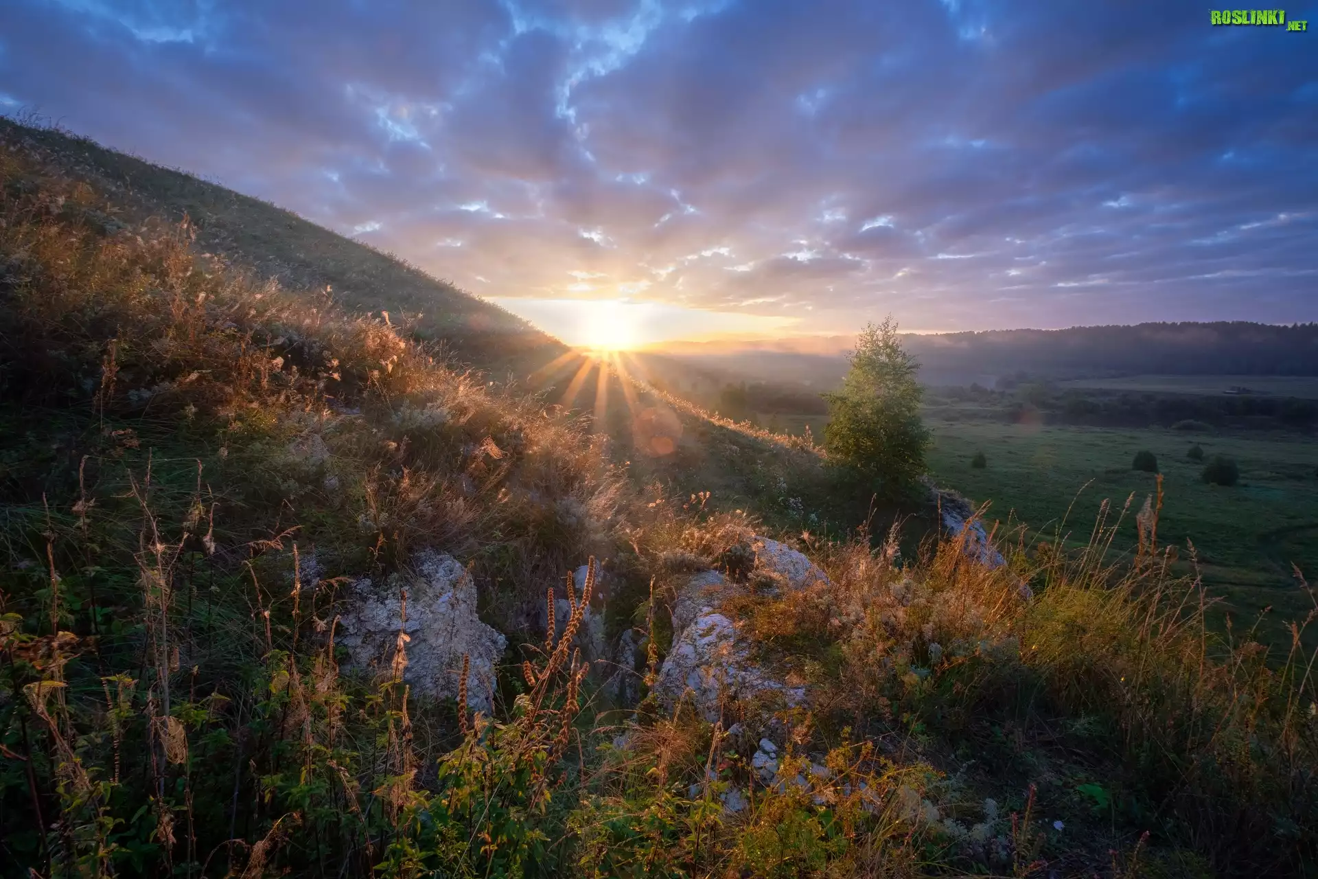 Rośliny: Wzgórza, Drzewa, Rośliny, Skały, Promienie słońca, Chmury