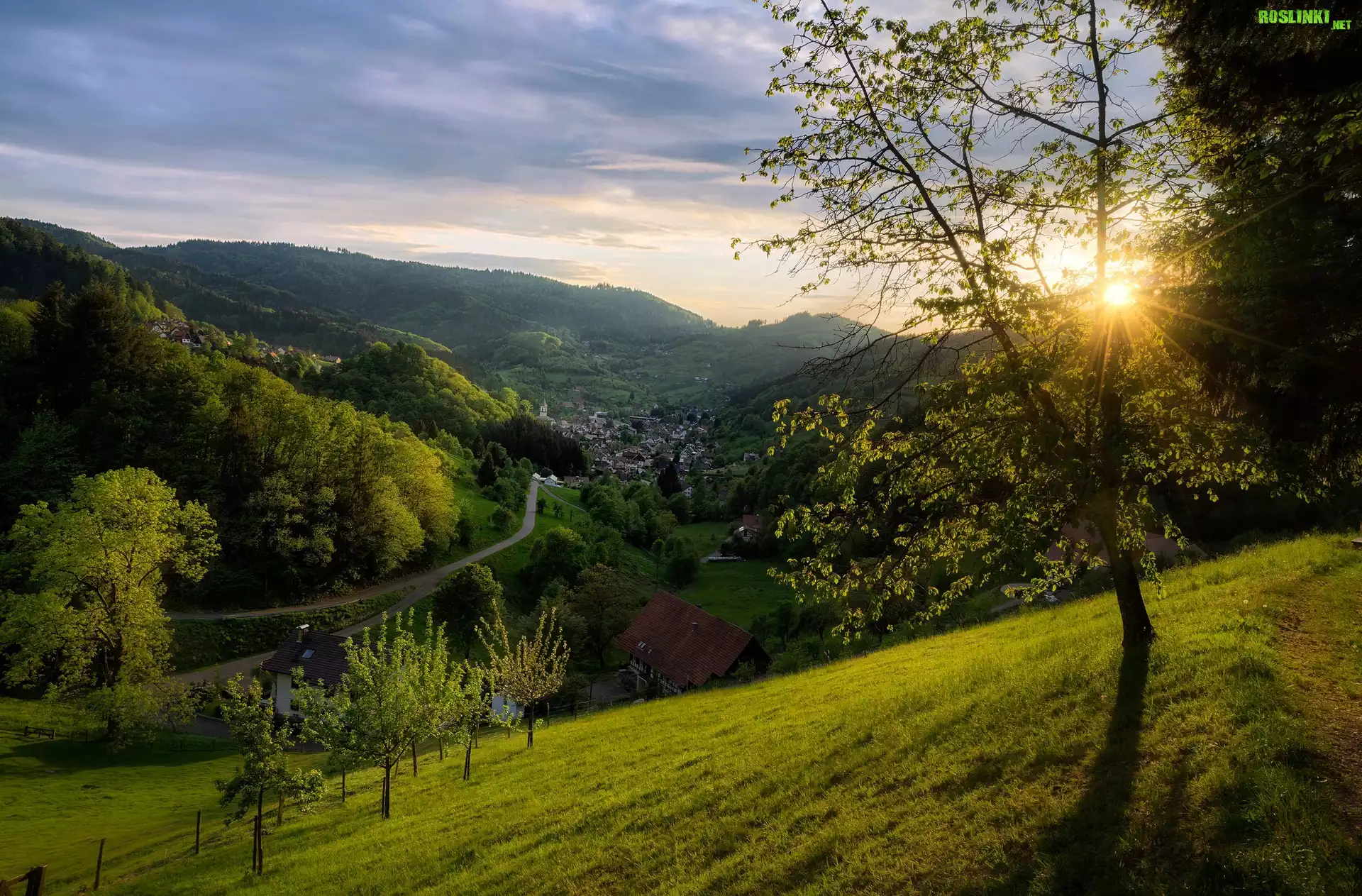 Rośliny: Wzgórza, Drzewa, Dolina, Domy, Droga, Promienie słońca