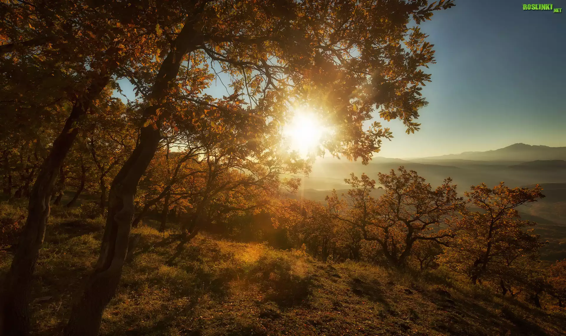 Rośliny: Drzewa, Promienie słońca, Wzgórza, Jesień