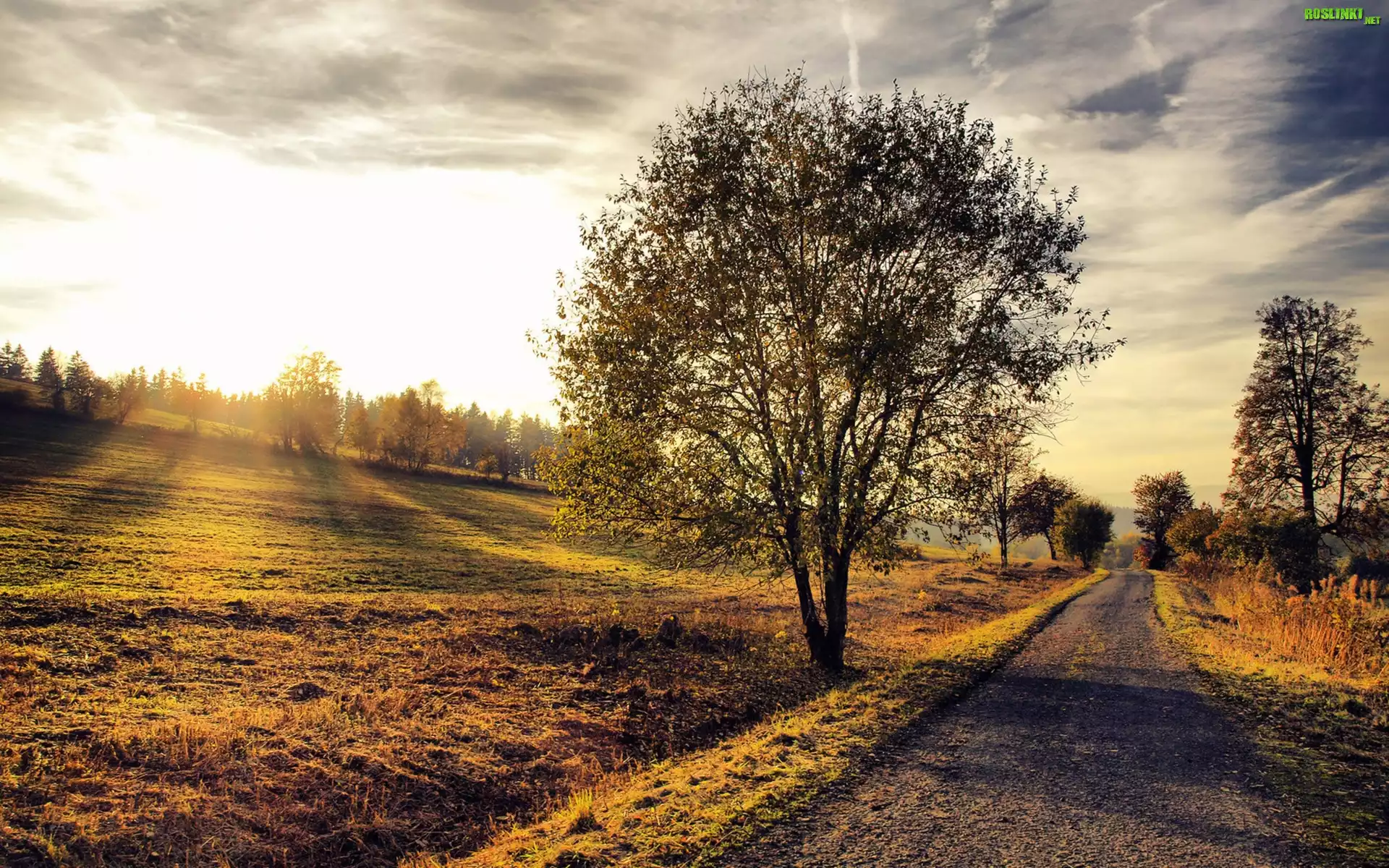 Rośliny: Drzewa, Droga, Zachmurzone, Niebo