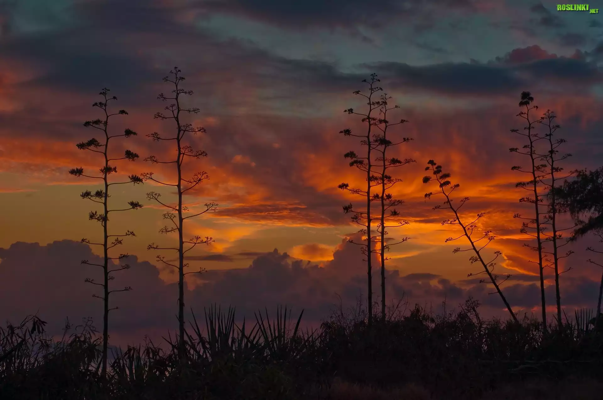 Drzewa, Trawy, Chmury, Zachód, Słońca