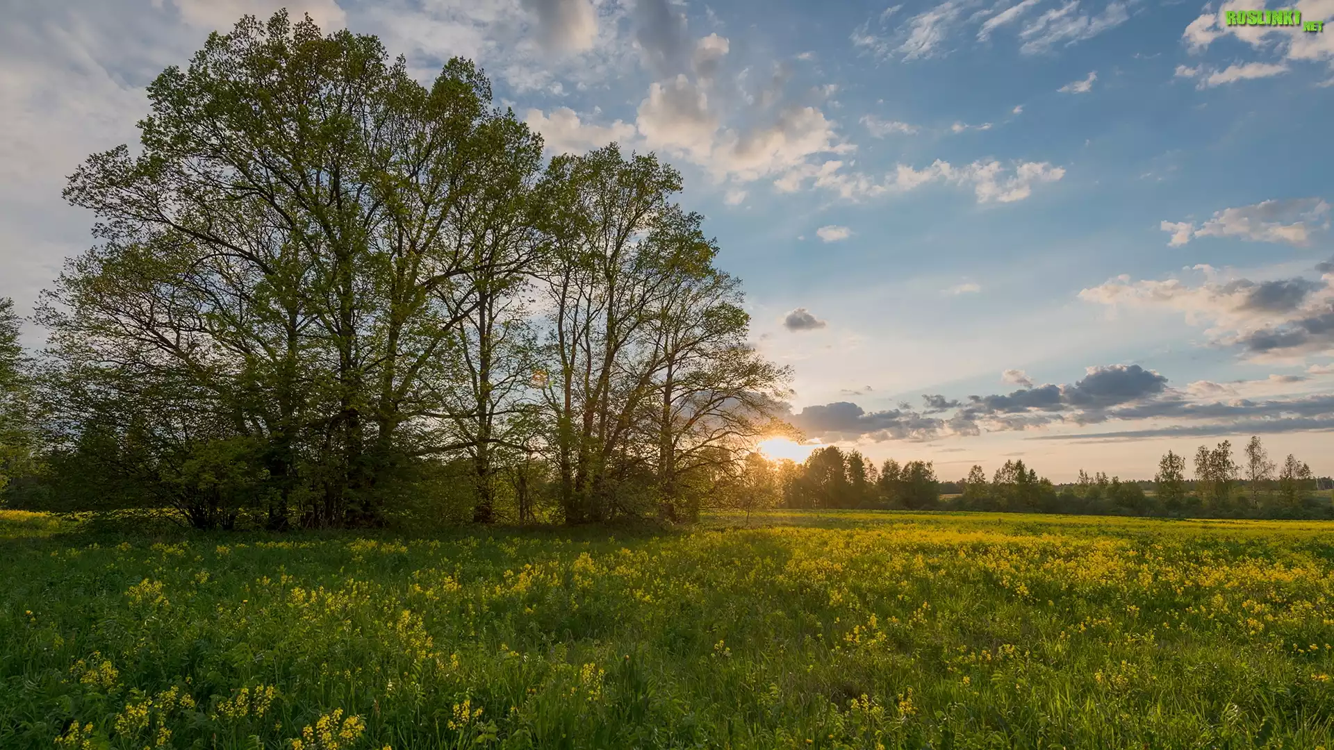 Rośliny: Drzewa, Łąka, Wiosna, Zachód słońca