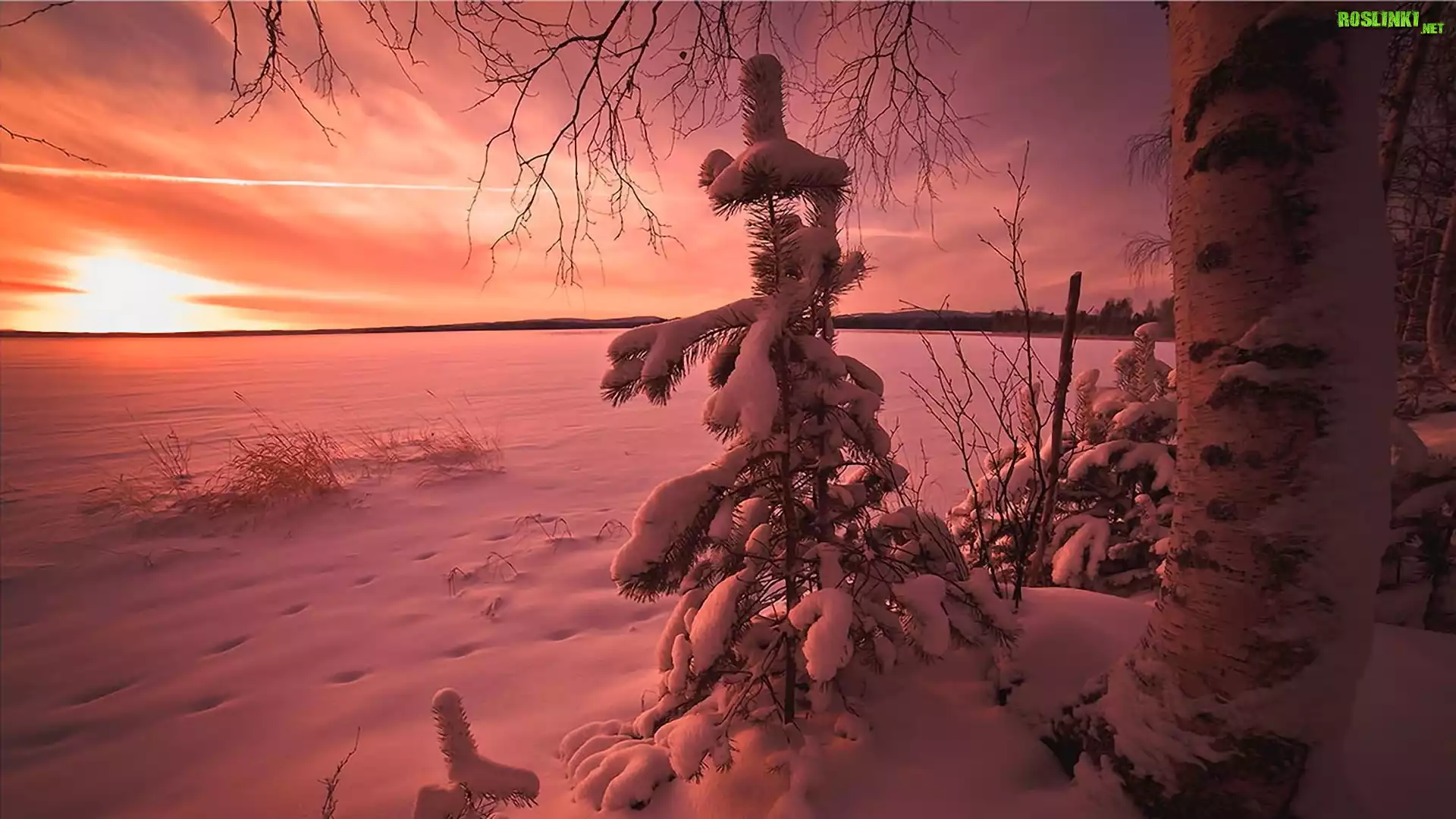 Rośliny: Drzewa, Śnieg, Zima, Sosna, Zachód słońca