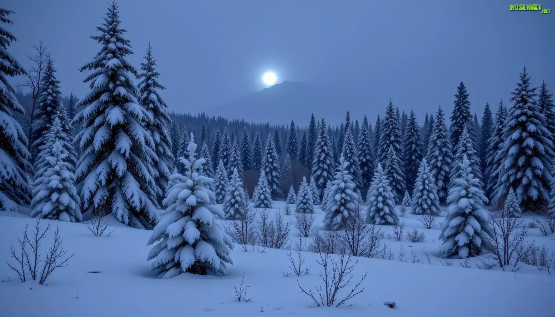 Rośliny: Zima, Las, Księżyc, Drzewa