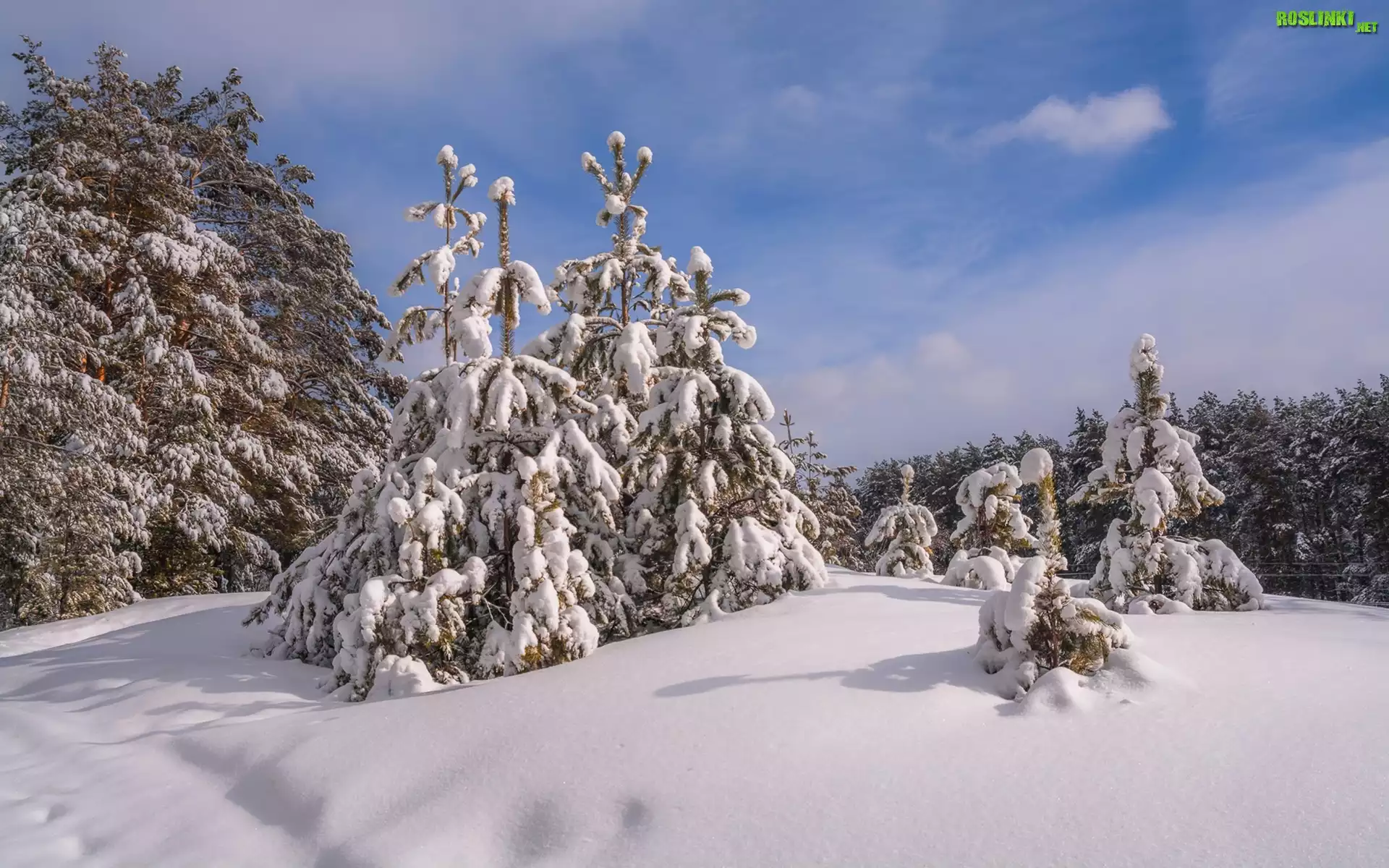 Rośliny: Ośnieżone, Drzewa, Zima, Świerki, Niebo