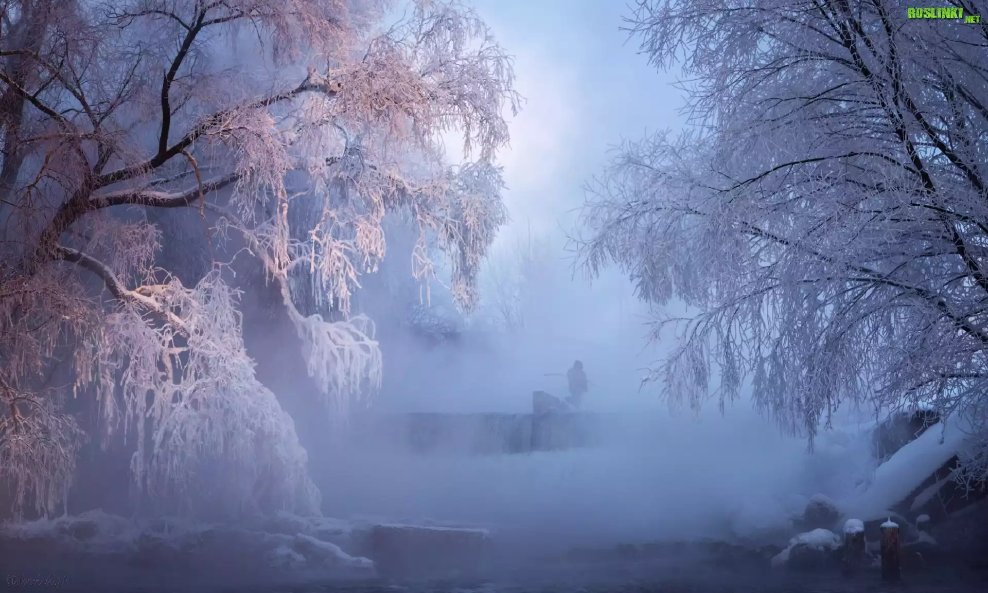 Rośliny: Zima, Drzewa, Mgła, Szron, Śnieg, Wędkarz, Poranek