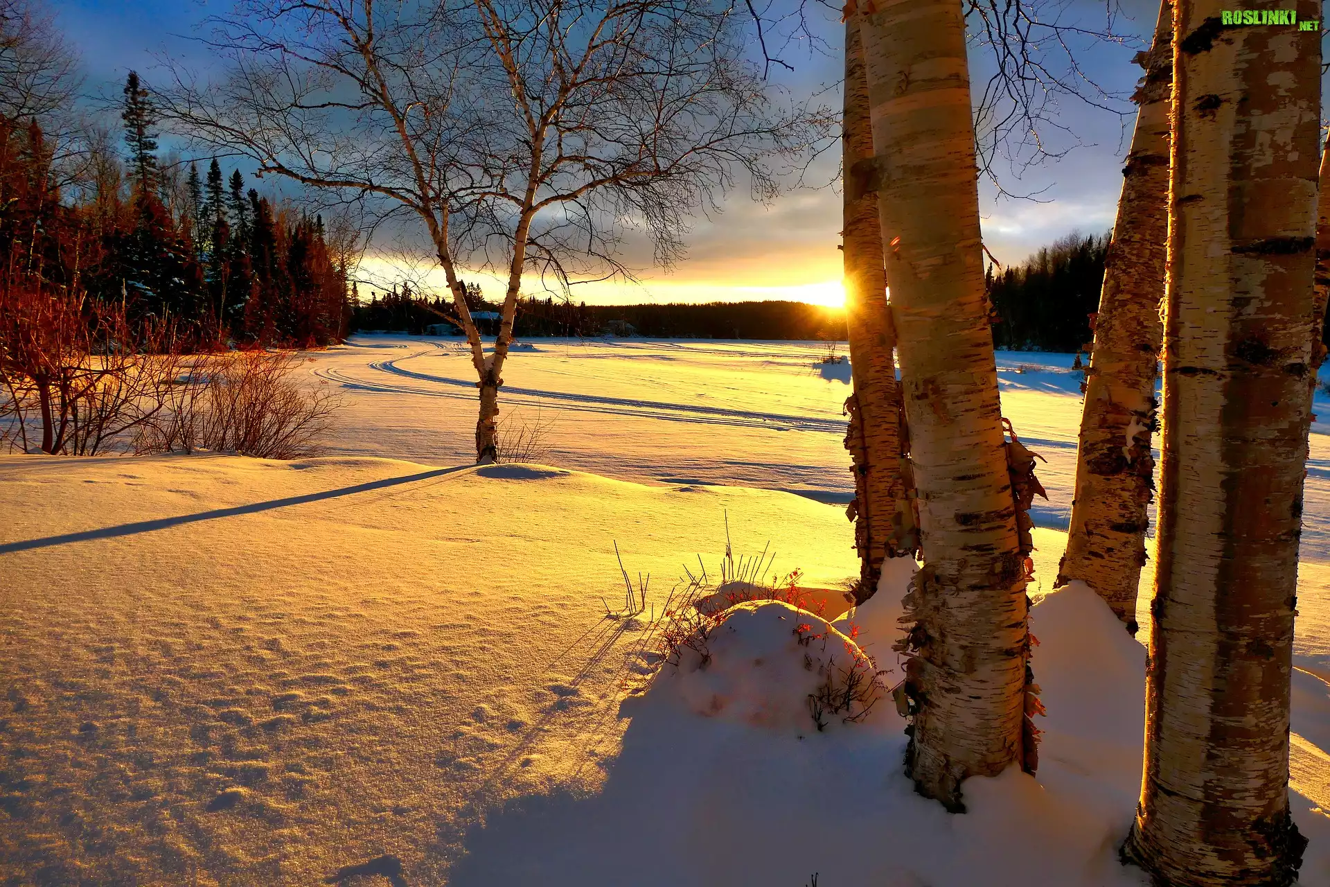 Rośliny: Zima, Drzewa, Brzozy, Zaśnieżona, Łąka, Zachód słońca