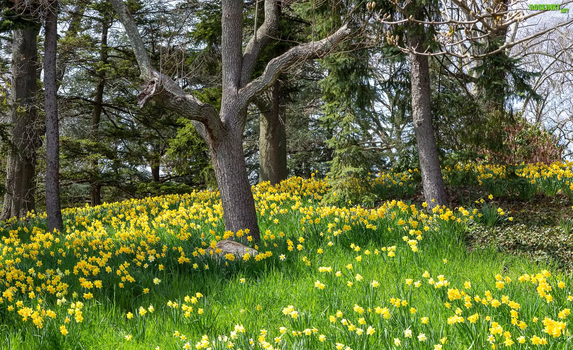 Rośliny: Żółte, Kwiaty, Żonkile, Drzewa
