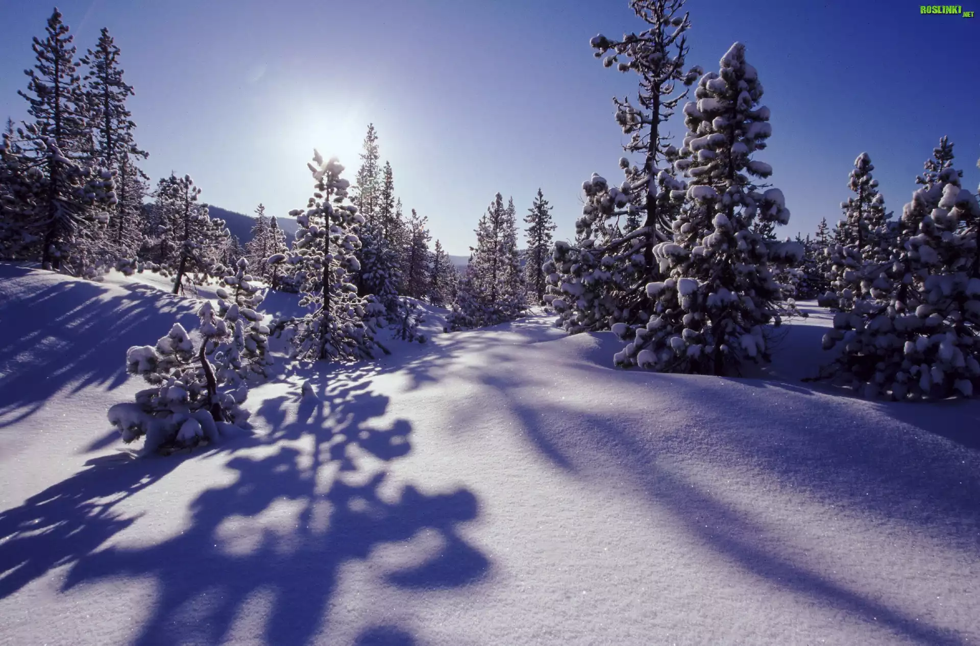 Drzewka, Pokryte, Śniegiem, Promienie, Słońca