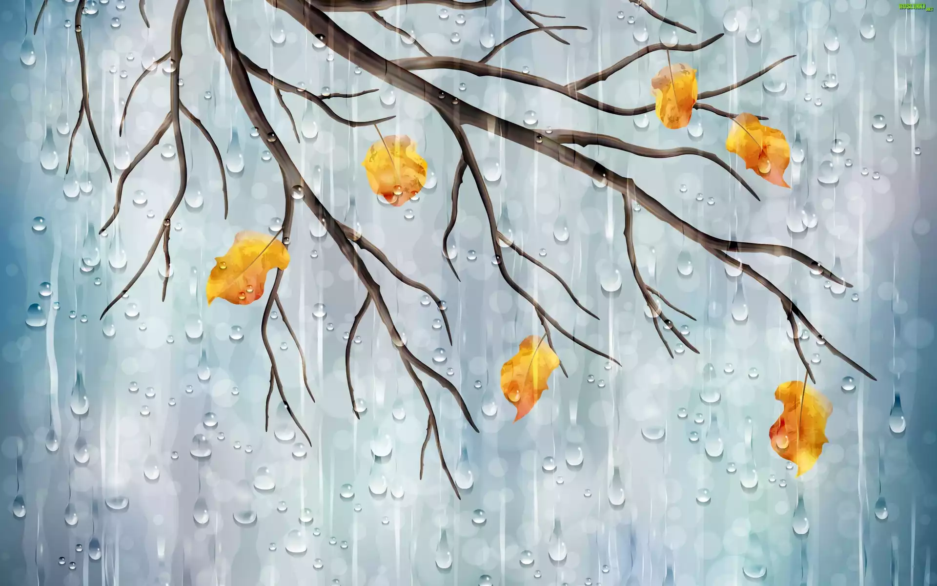 Rośliny: Drzewo, Gałąź, Liście, Jesień, Deszcz, Grafika
