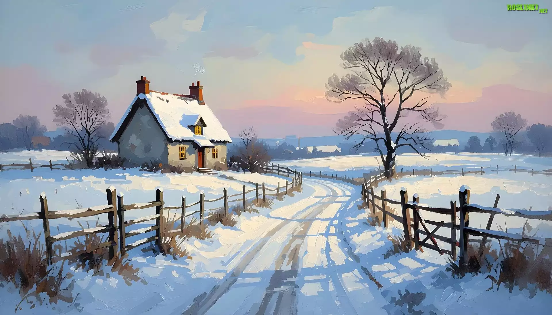 Rośliny: Zima, Drzewo, Dom, Ogrodzenie, Droga