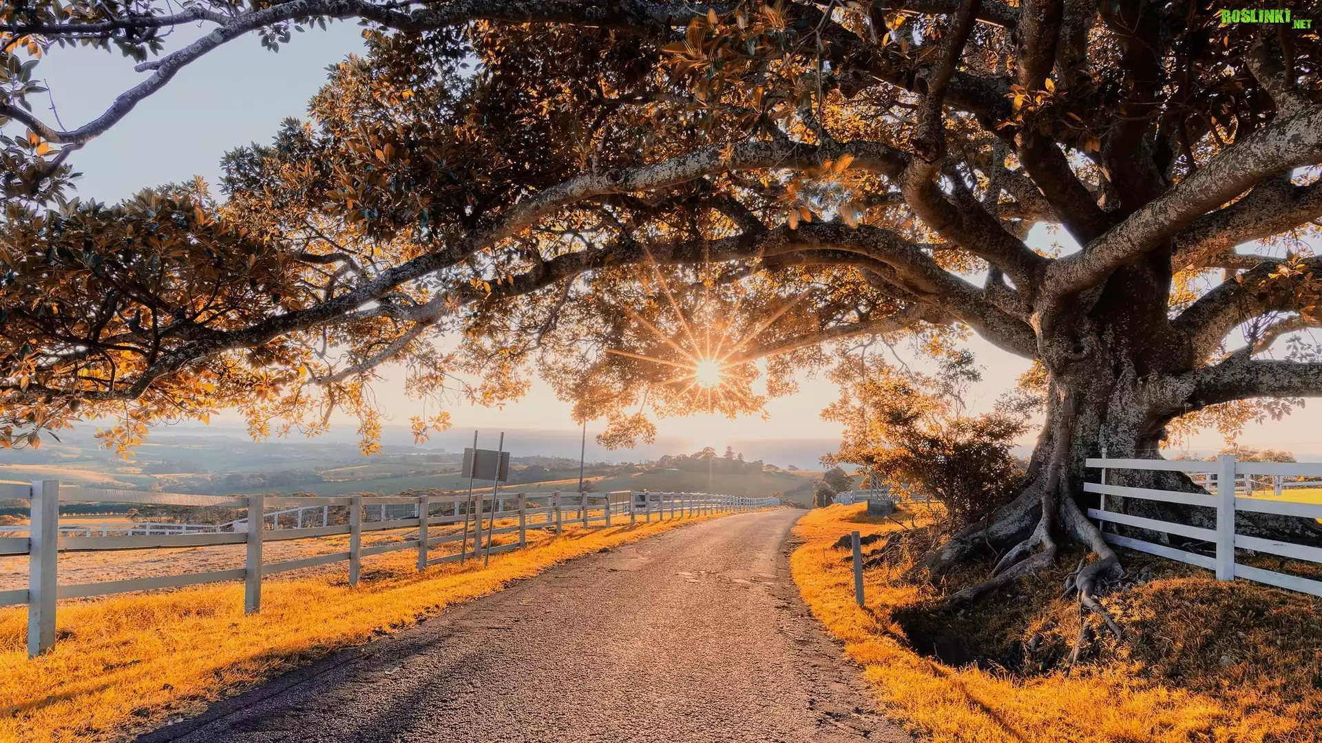 Rośliny: Drzewo, Promienie słońca, Droga, Ogrodzenie
